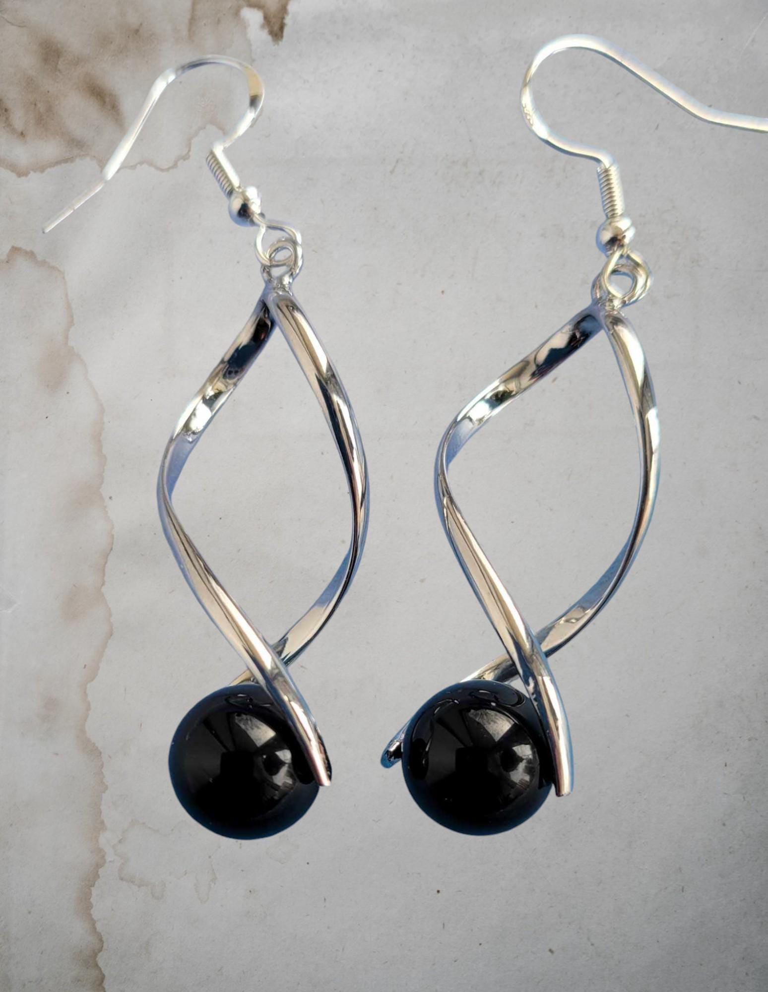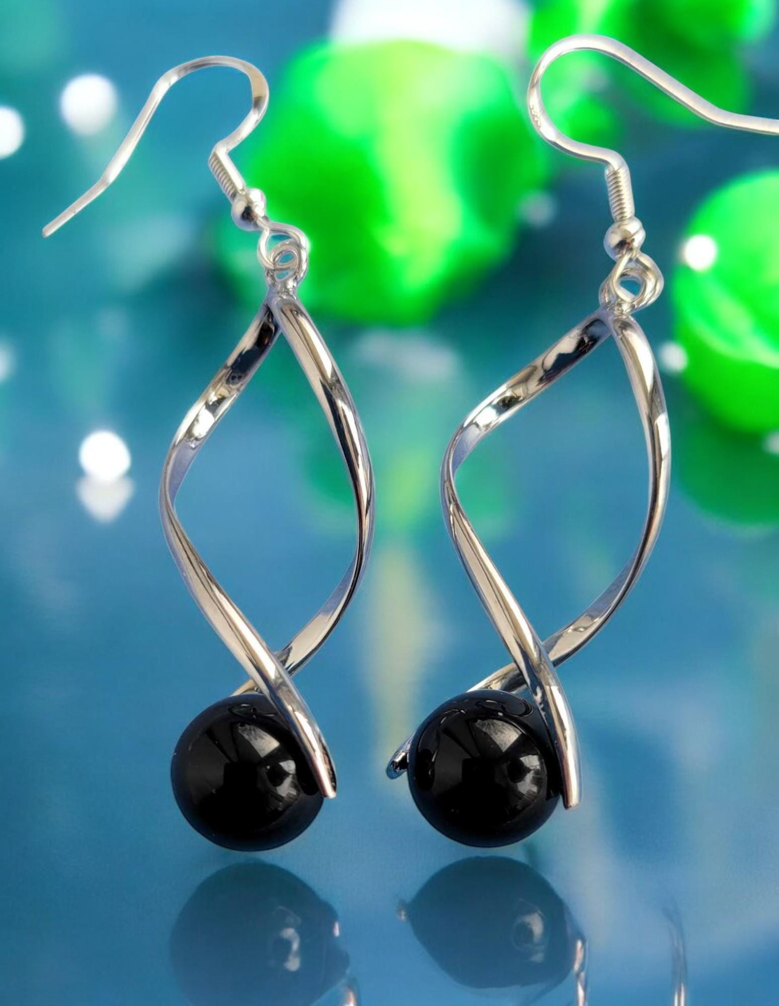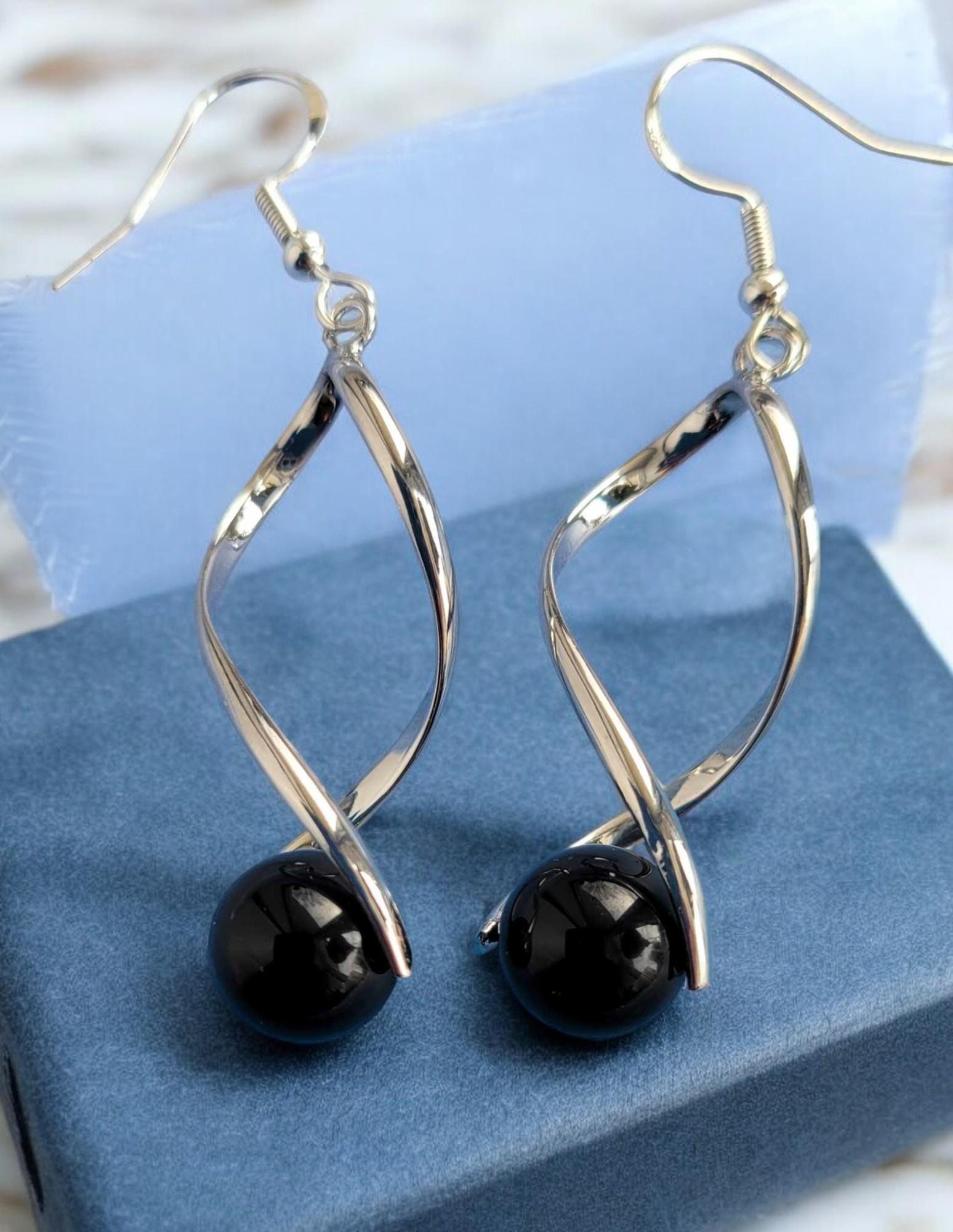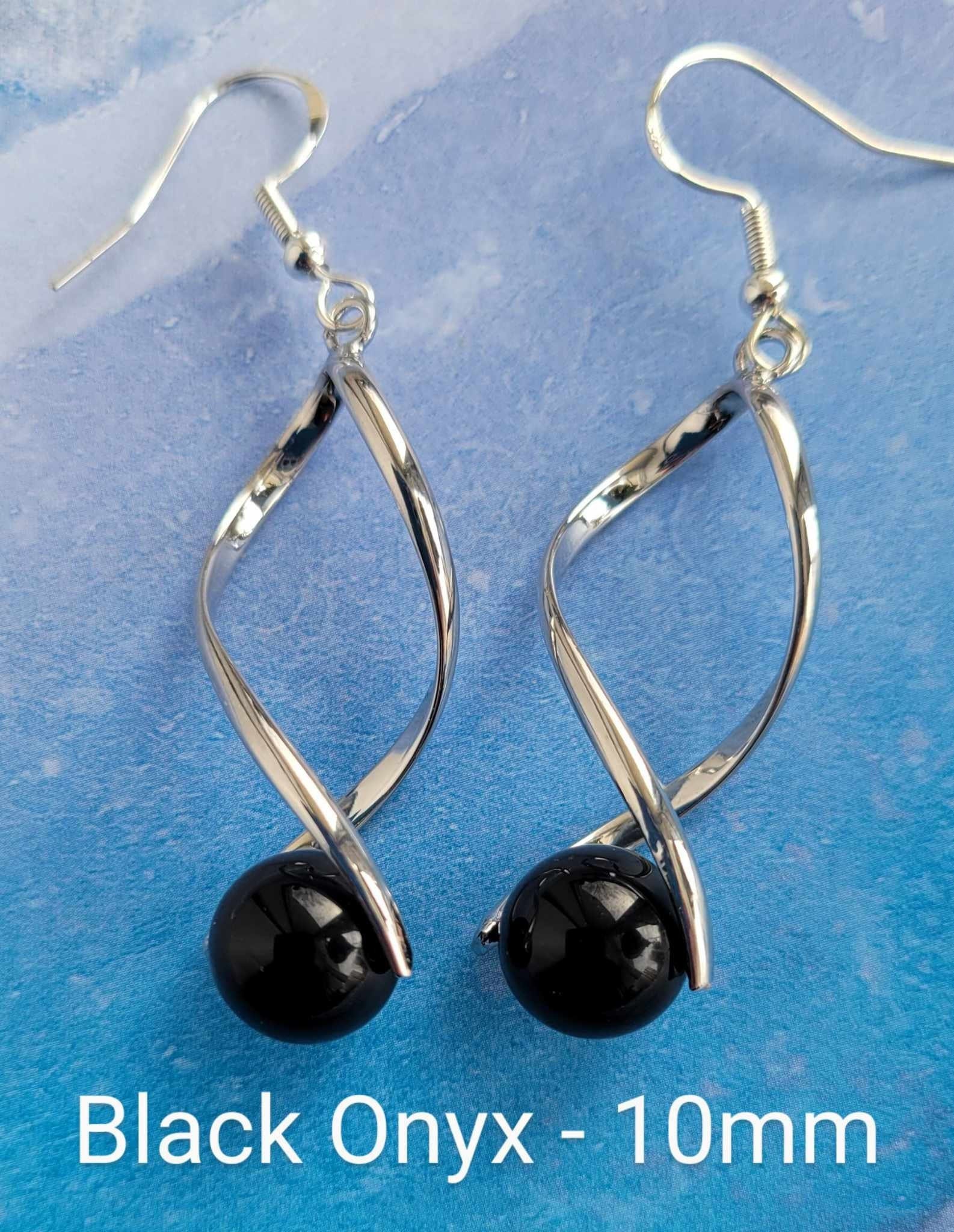 Black Onyx Silver Tone Twist Earrings (10mm)