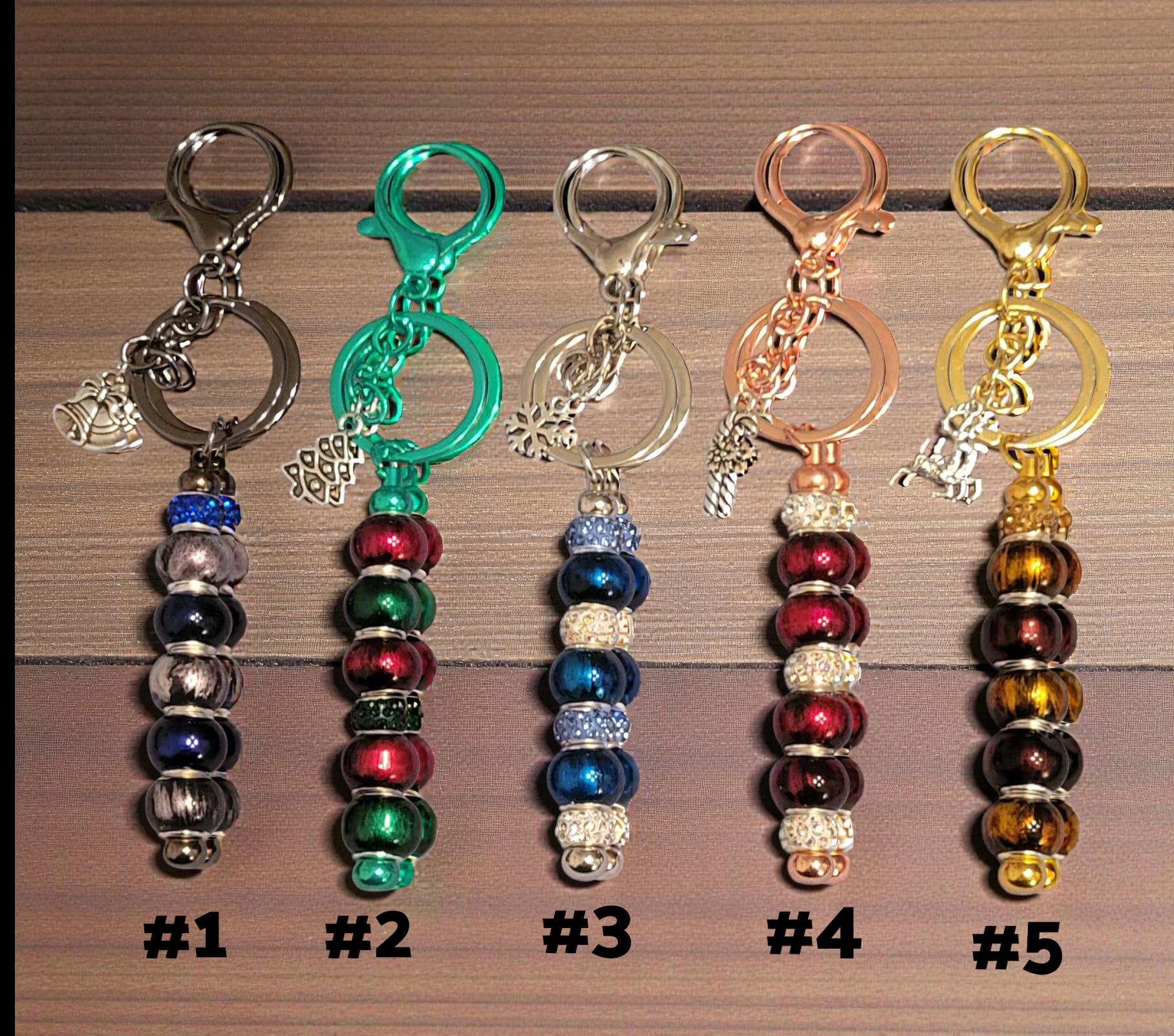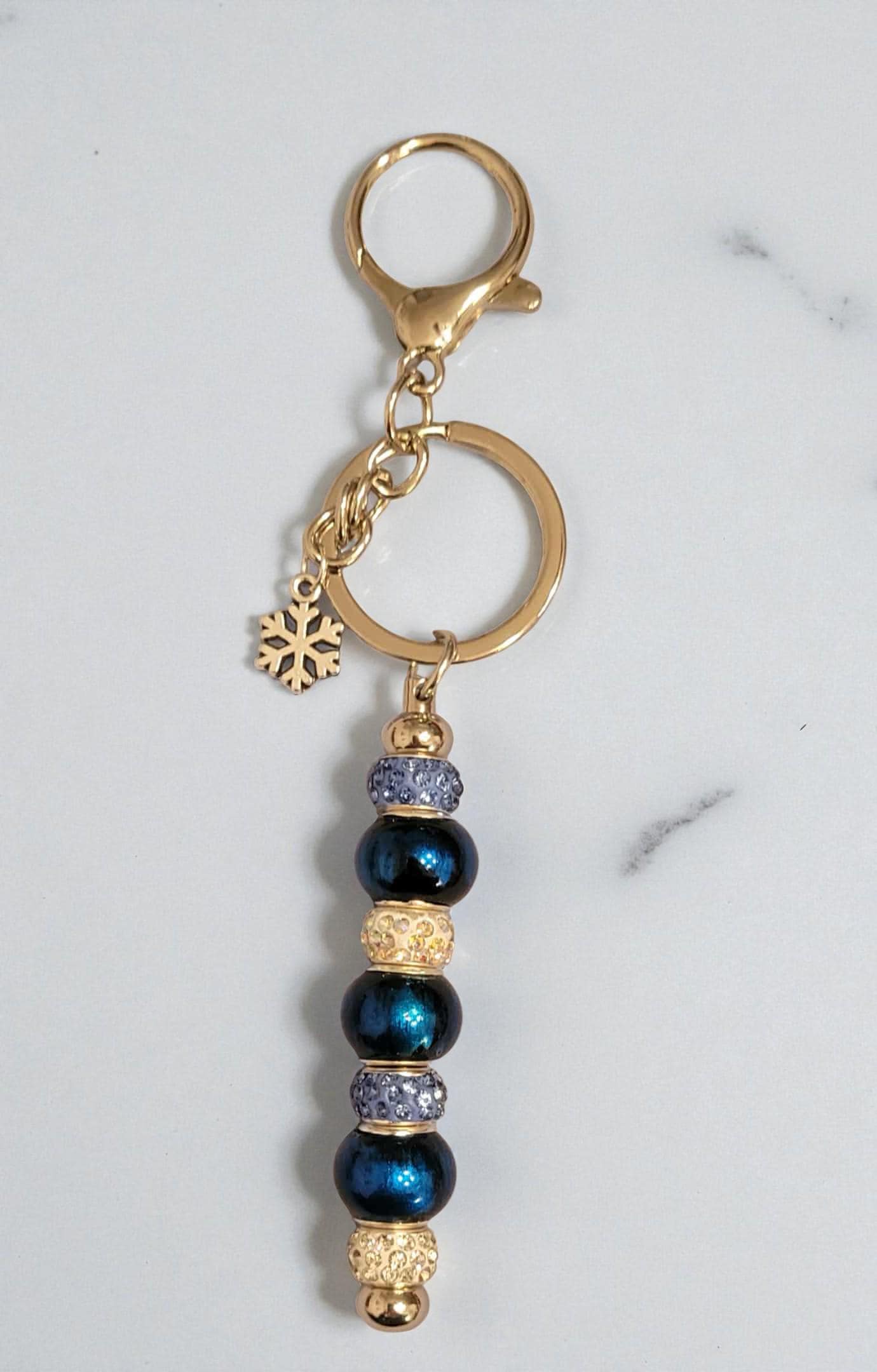 Option 3 - Silver Tone Keychain w/Silver Tone Snowflake Charm - 15 x 11mm Blue Murano Glass Beads with White Spacers w/Clear Rhinestone Beads and Blue Rhinestone Spacer Bead. Keychain measures approximately 5 3/4" x 1". Snowflake Charm measures approximately 1/2" x 1/2".