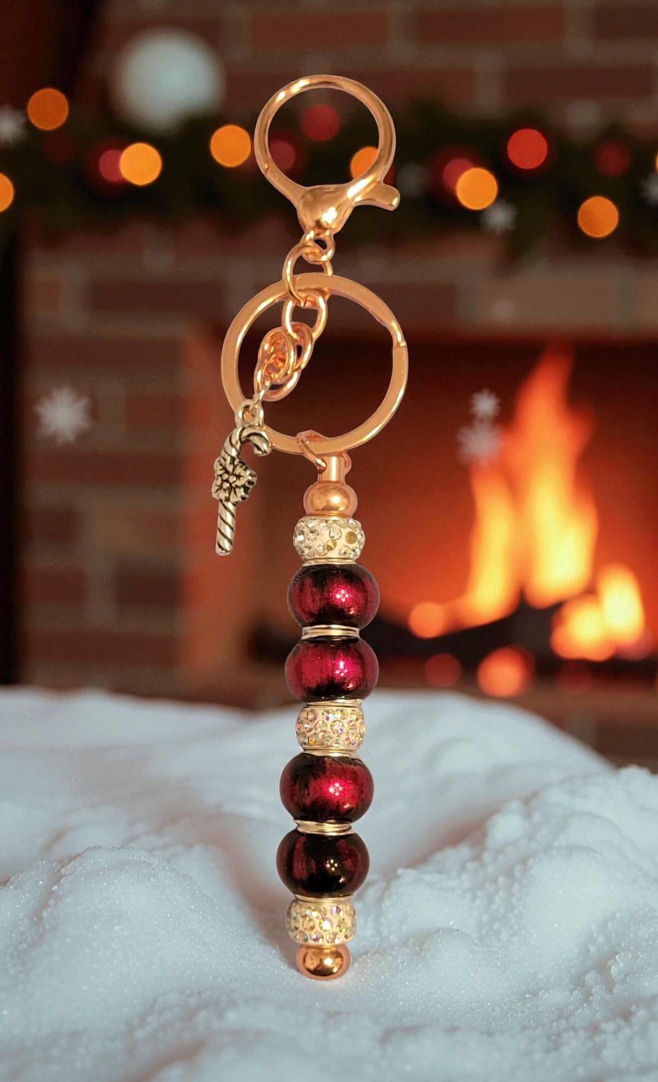 Option 4 - Rose Gold Keychain w/Silver Tone Candy Cane Charm - 15 x 11mm Red Murano Glass Beads with White Spacers w/Clear Rhinestone Beads. Keychain measures approximately 5 3/4" x 1". Candy Cane Charm measures approximately 1" x 1/4".