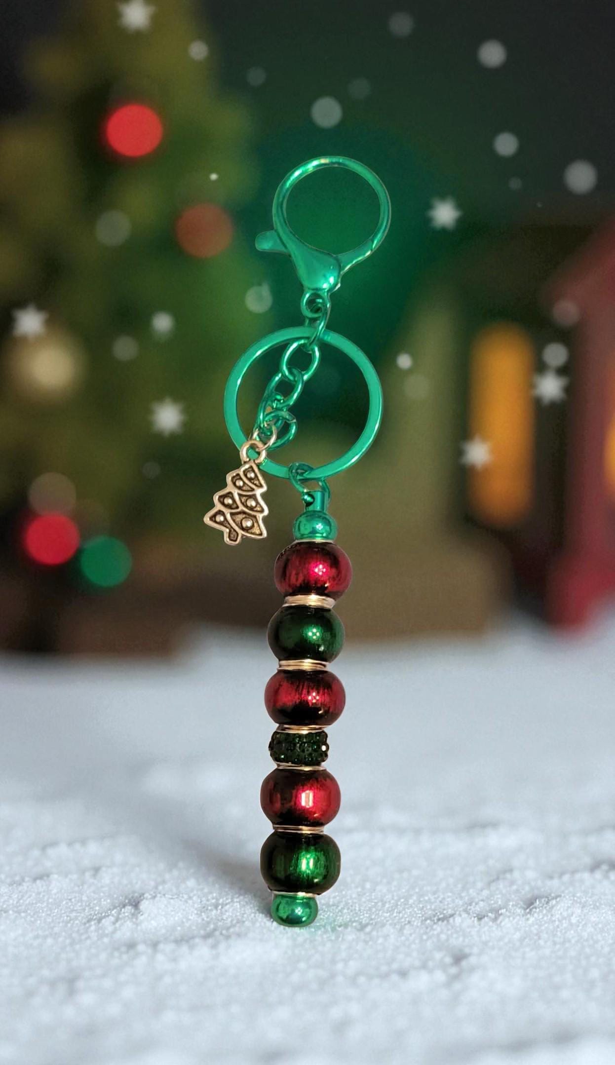 Option 2 - Green Metal Keychain w/Silver Tone Christmas Tree Charm - 15 x 11mm Red and Green Murano Glass Beads with Green Rhinestone Spacer Bead. Keychain measures approximately 5 3/4" x 1". Tree Charm measures approximately 3/4" x 1/2".