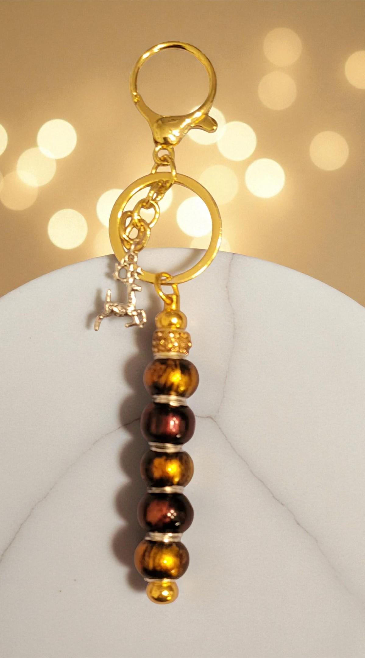 Option 5 - Gold Tone Keychain w/Silver Tone Reindeer Charm - 15 x 11mm Gold and Bronze Murano Glass Beads with Bronze Rhinestone Spacer Bead. Keychain measures approximately 5 3/4" x 1". Reindeer Charm measures approximately 3/4" x 1/2".