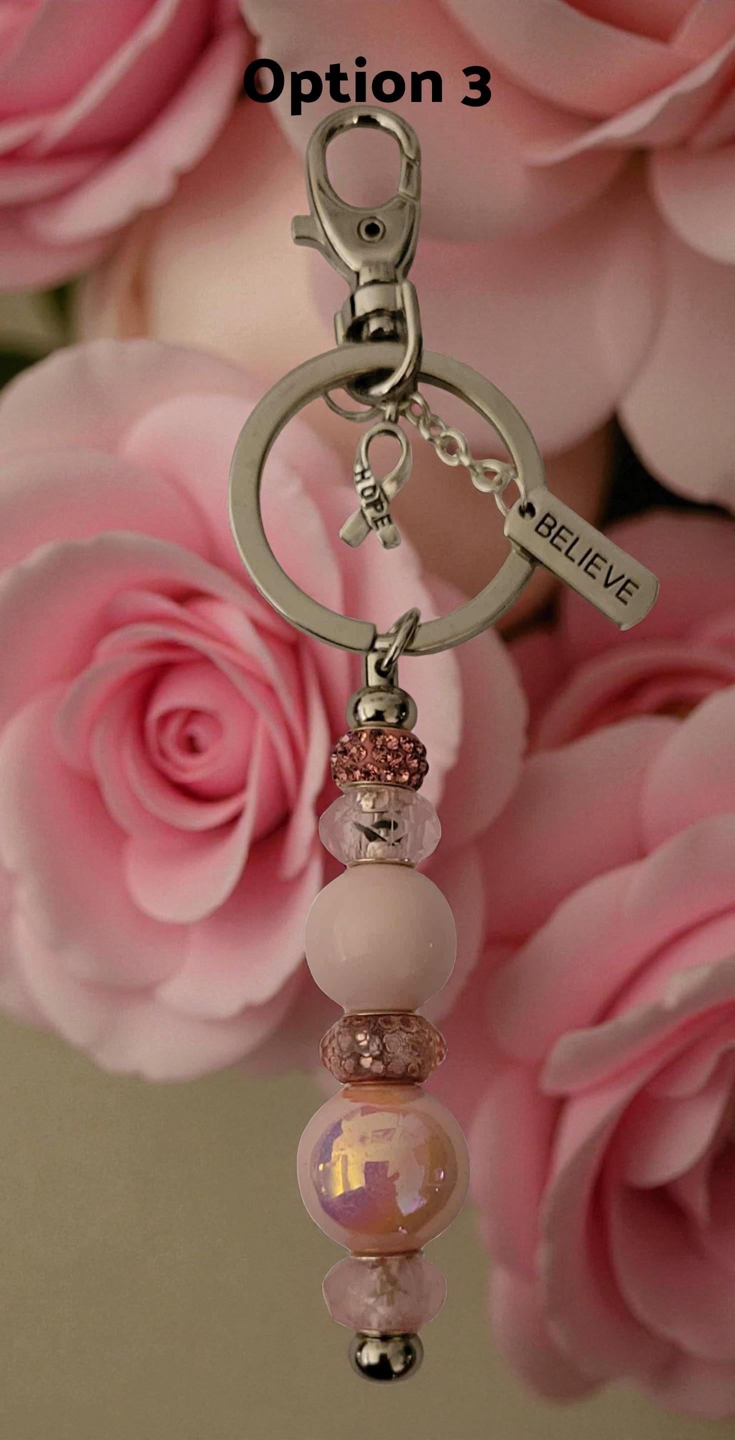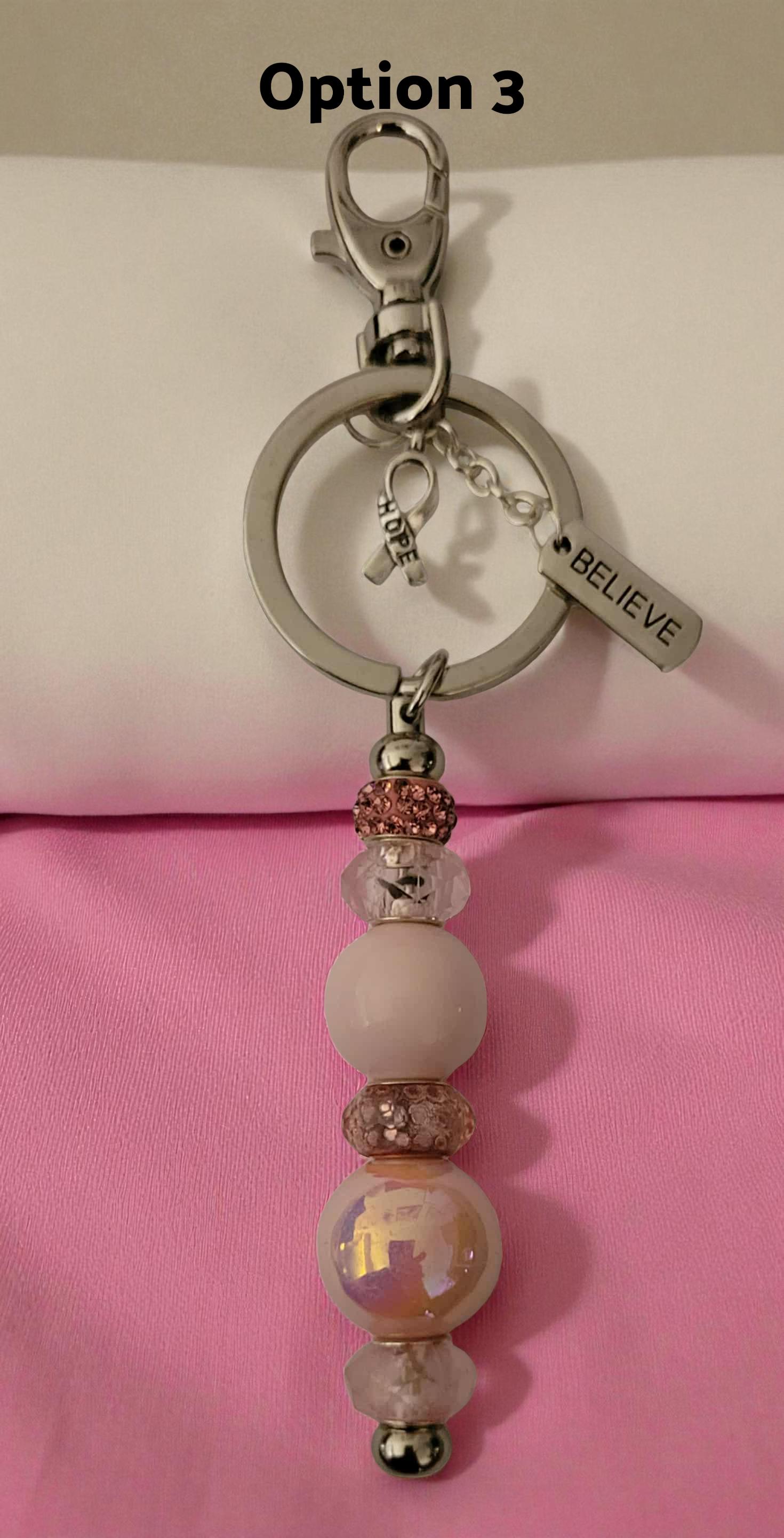 Option 3 - Silver Tone Pink Beaded Keychain - This keychain features light pink beads with various finishes. There is a silver tone ribbon with the word "Hope" and a rectangular silver tone charm with the word "BELIEVE". Keychain measures approximately 5 1/2" x 1 1/2". Key ring measures approximately 1/2".