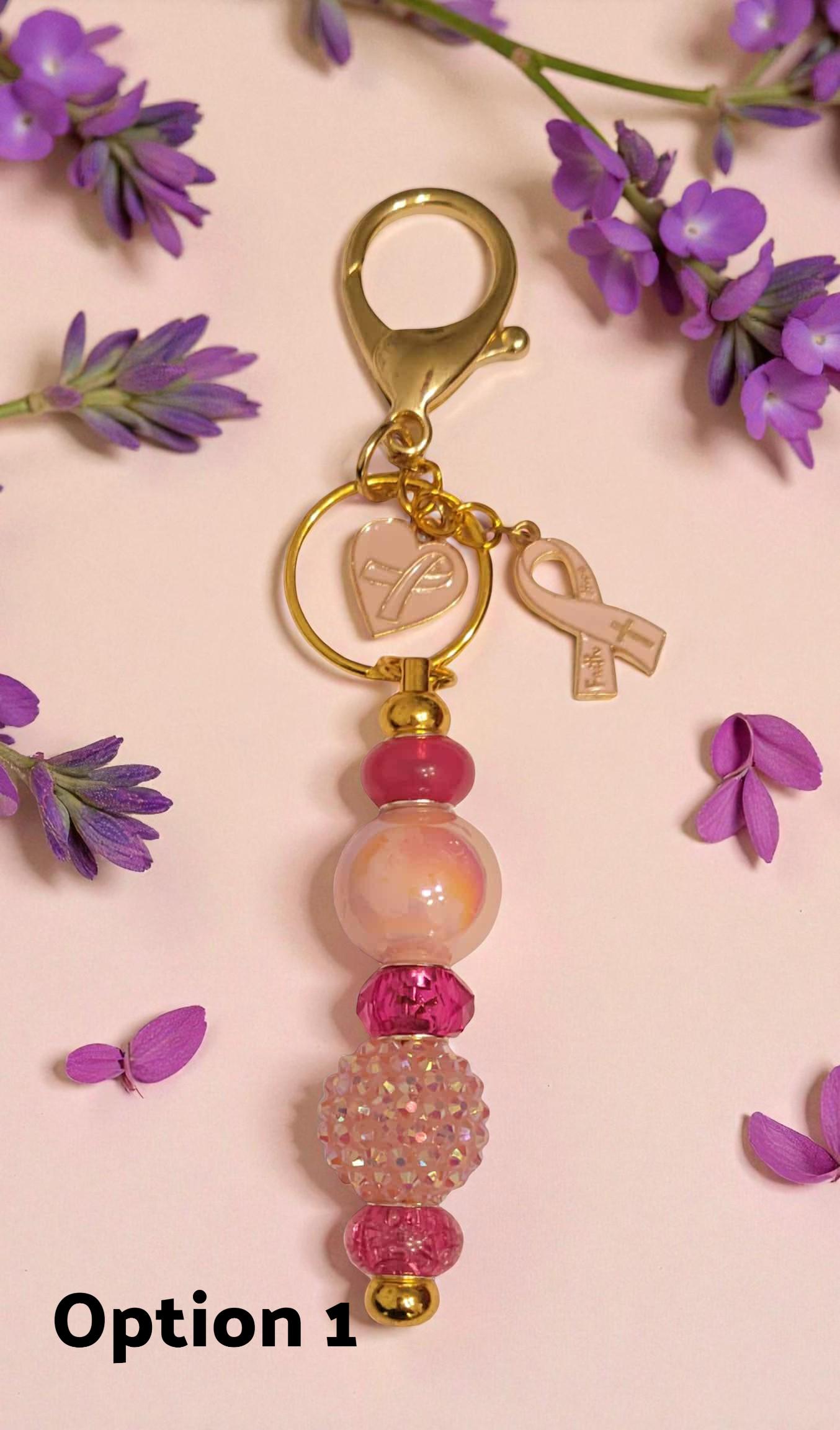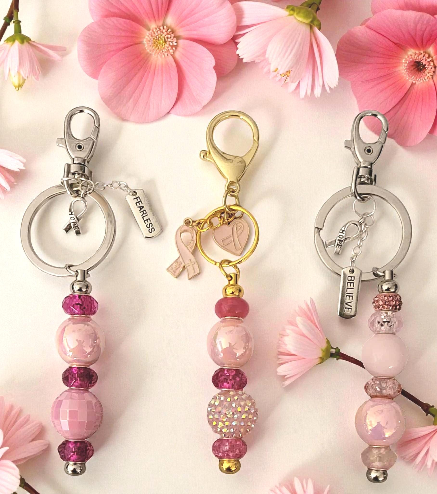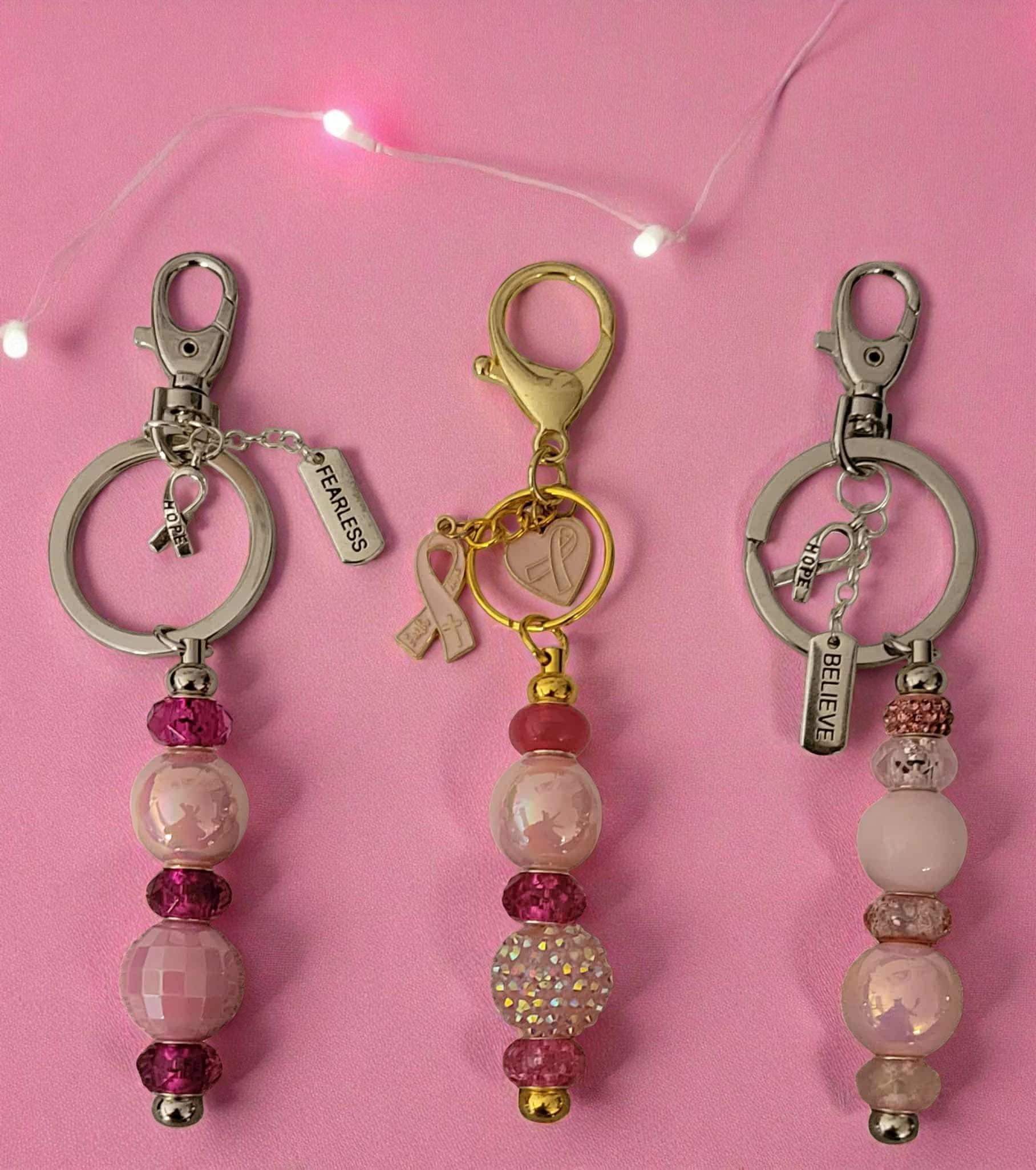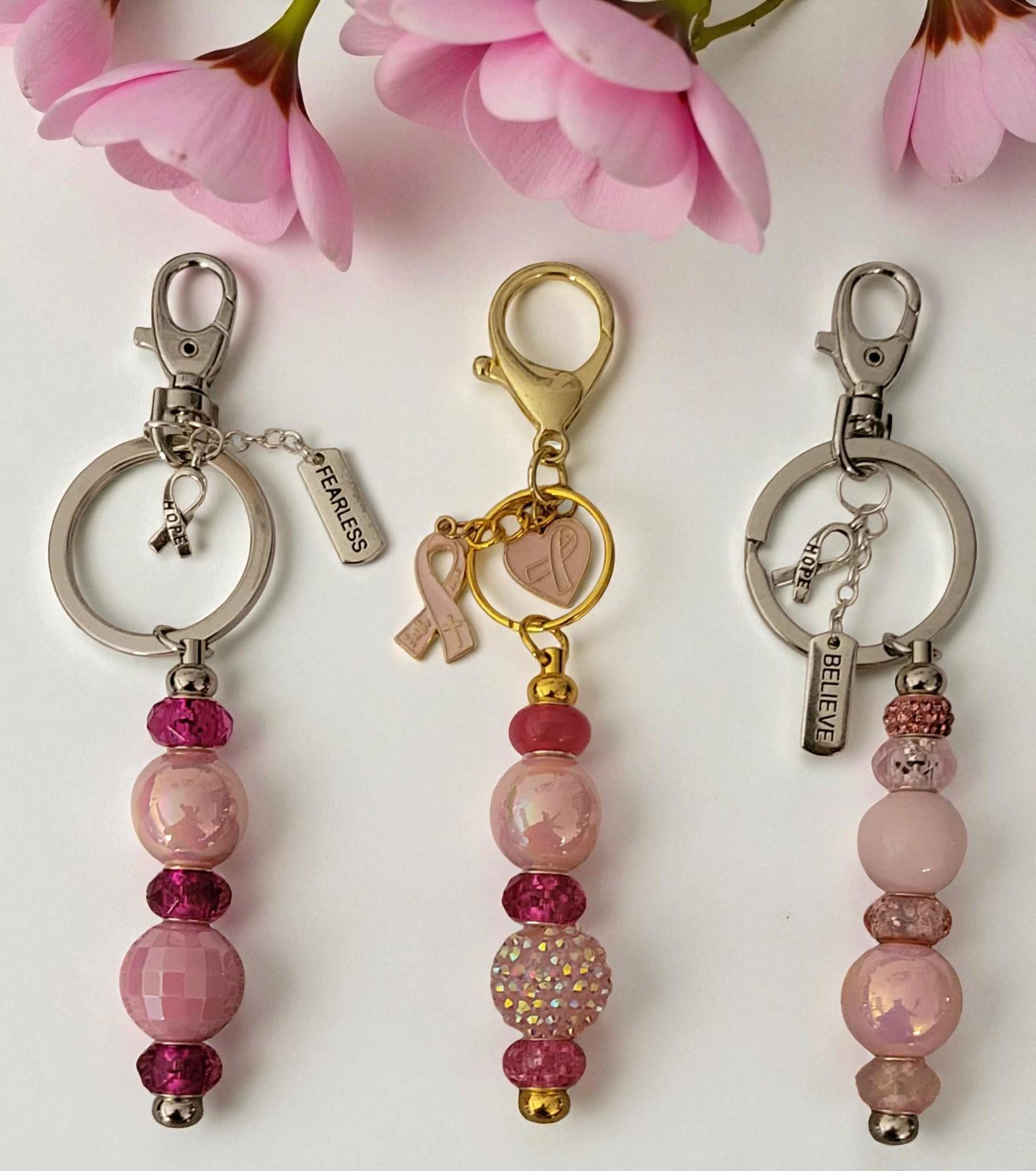 Breast Cancer Awareness Keychains - Show your support this month and every month with these pretty keychains. They are made with glass, resin, and plastic beads, and come in silver and gold tone. More will be added, so check back often!