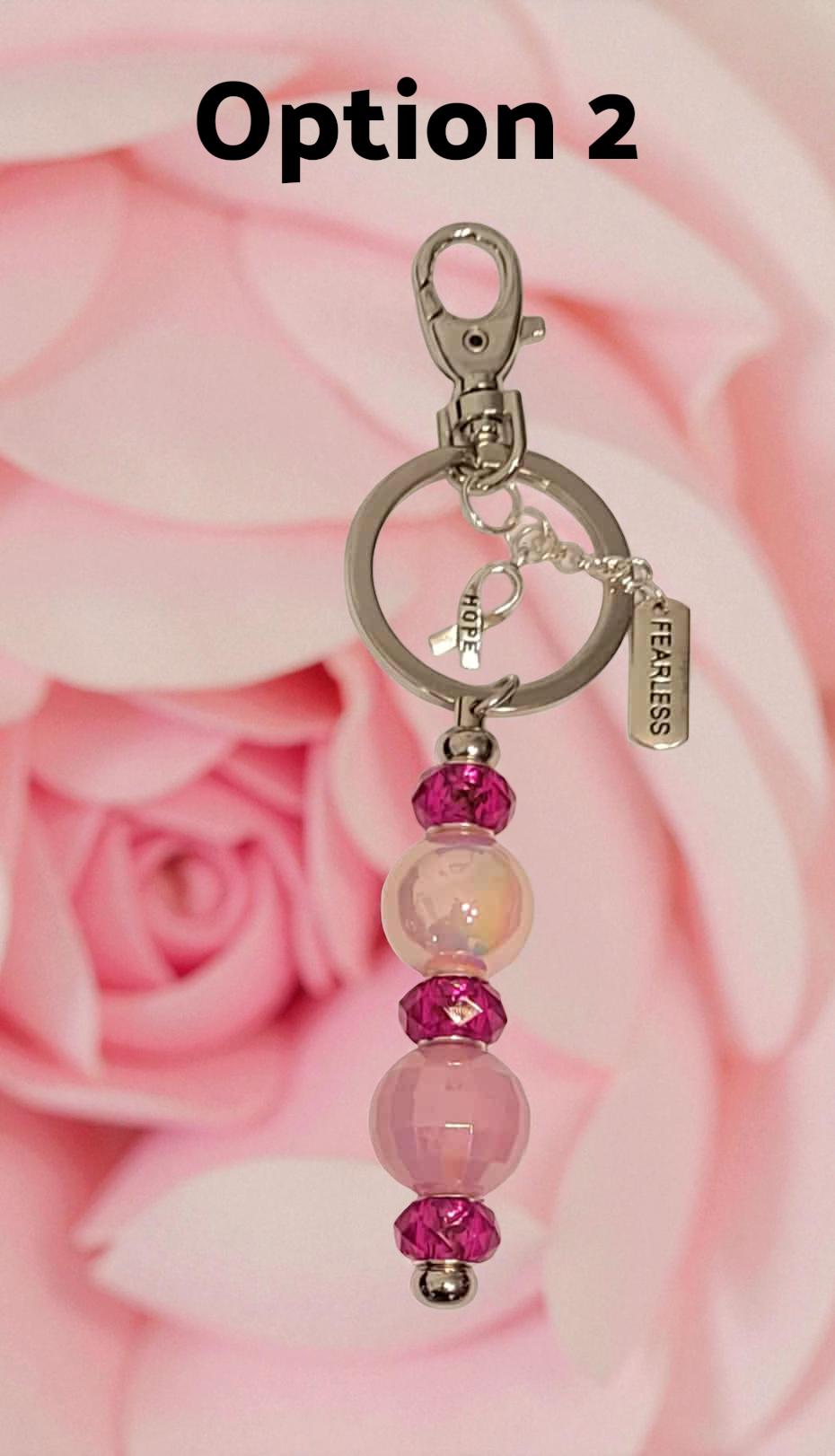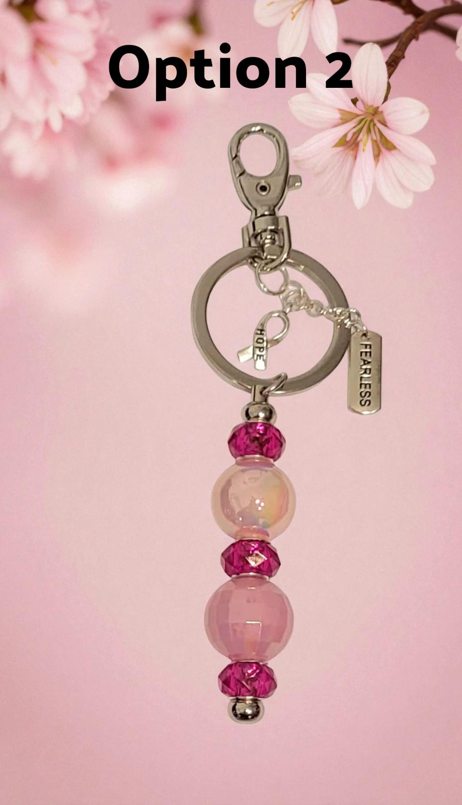 Option 2 - Silver Tone Light Pink Keychain - This keychain features light pink acrylic beads with dark pink crystal spacers, silver tone ribbon with "hope" written on the front, and a silver tone rectangular charm with "FEARLESS" on the front. Keychain measures approximately 5 1/2" x 1 1/2". Key ring measures approximately 1 1/2" in diameter.