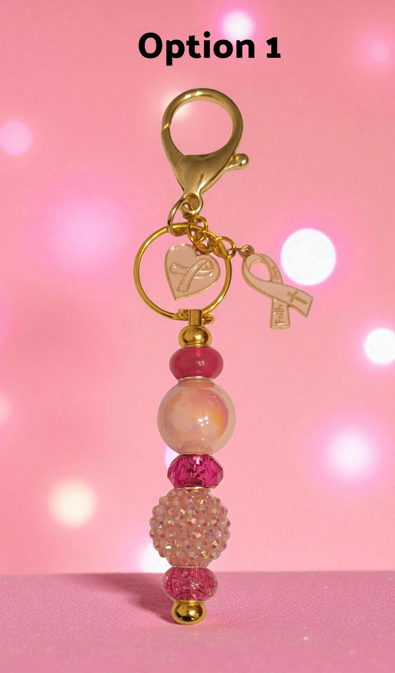 Option 1 - Gold Tone Light Pink Sparkle Keychain - This keychain features light pink acrylic beads with dark pink crystal spacer beads, pink enamel heart shaped charm w/ribbon in the center, and a pink enamel ribbon charm with the words "Faith" and "Hope" along with a cross in gold tone. Keychain measures approximately 5 1/2" x 1 ". Key ring measures 1" in diameter.