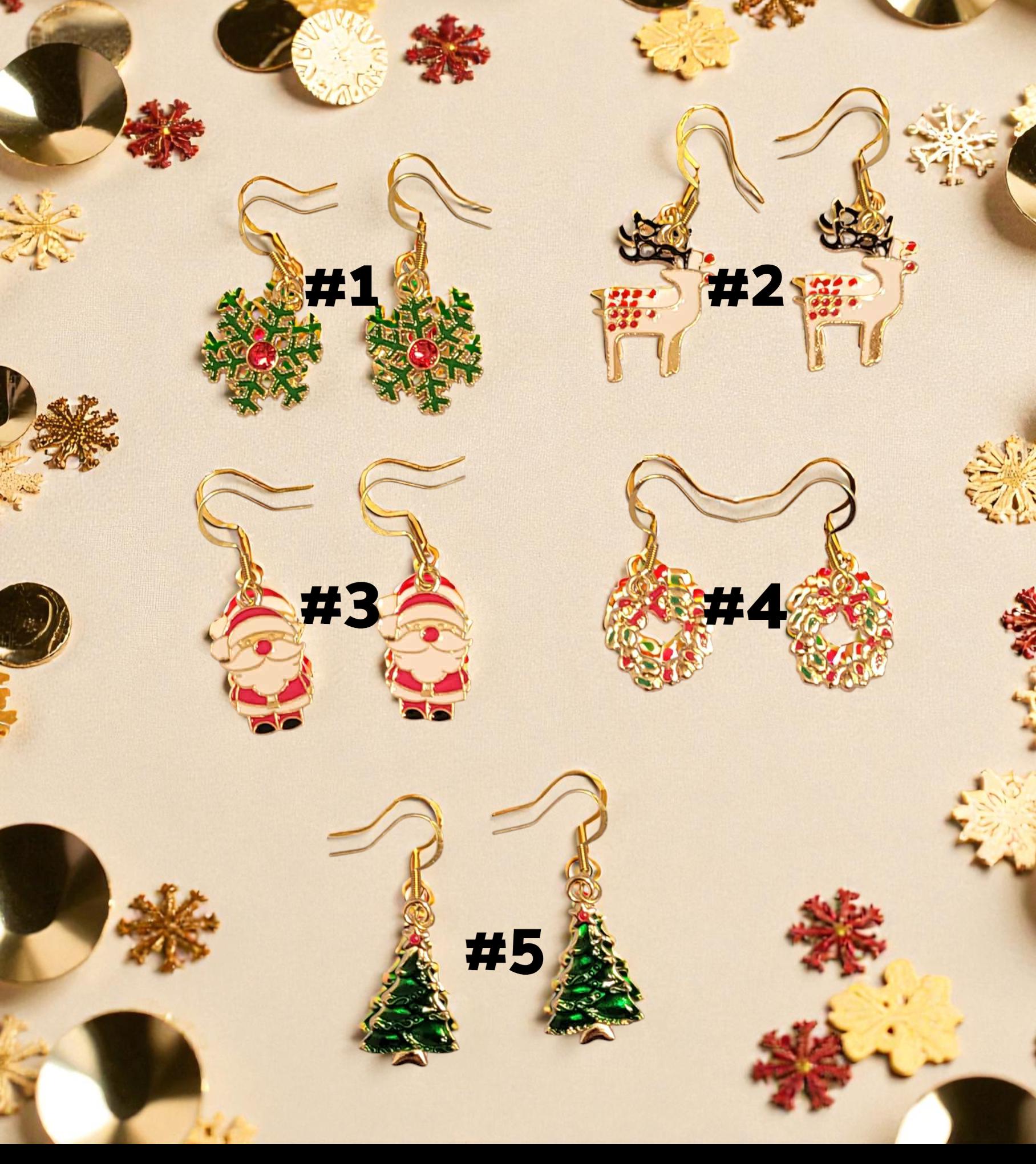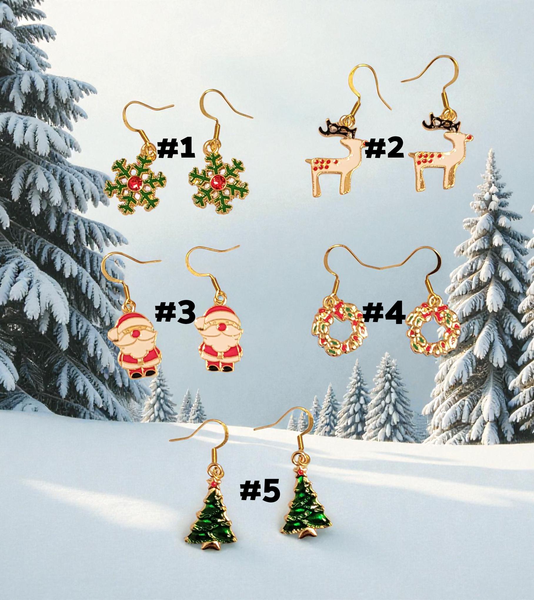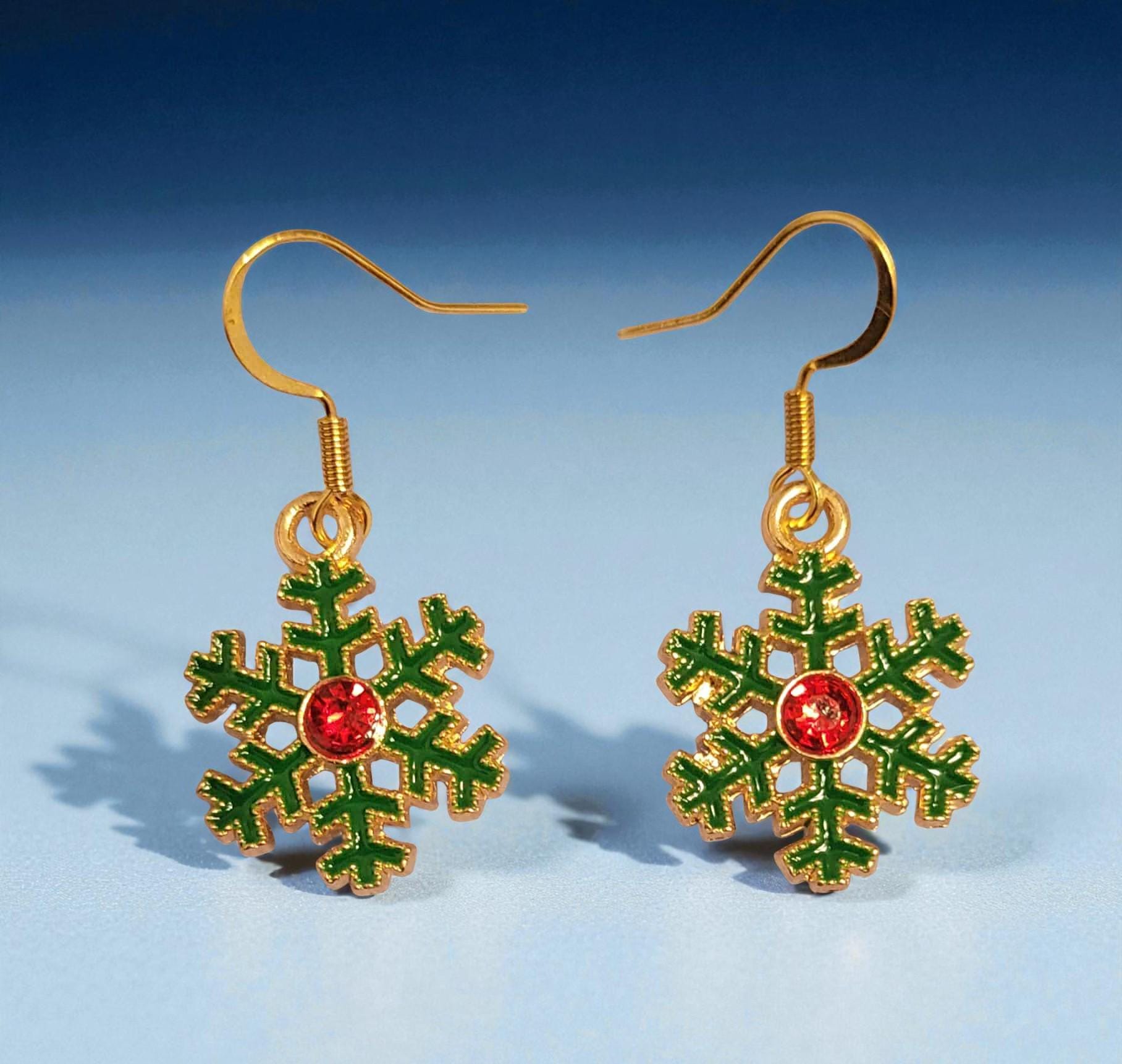 Option 1 - Snowflake - Gold tone with green enamel and red rhinestones. Earrings measure approximately 1" x 1/2".