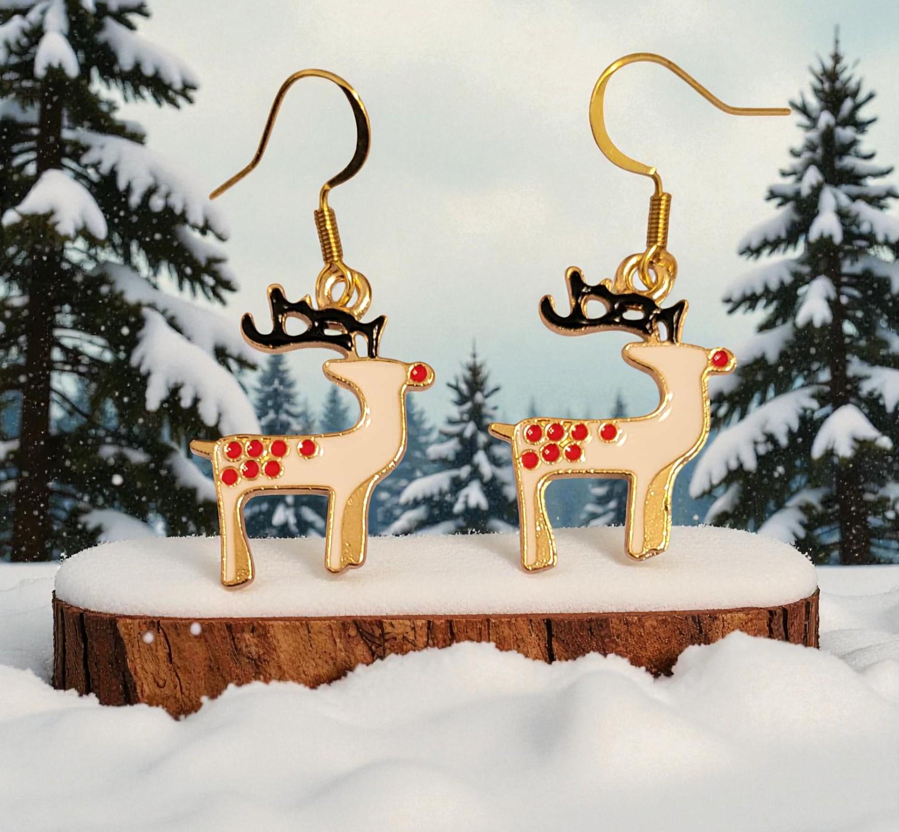 Option 2 - Reindeer - Gold tone with white, black, and red enamel. Earnings measure approximately 1 1/4" x 3/4".