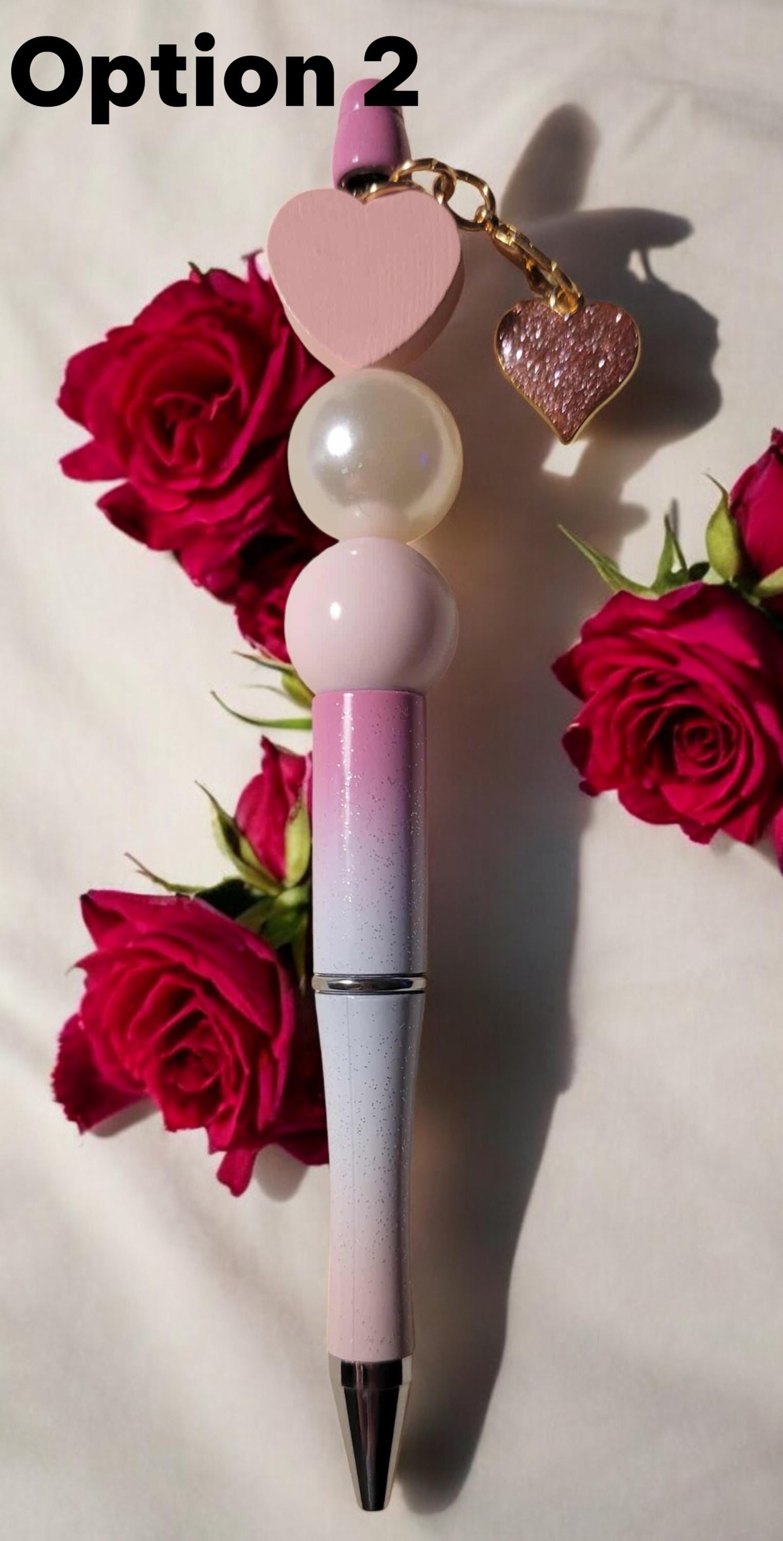 Option 2 - White/Pink Gradient Sparkle pen with pink wooden heart bead and white and pink acrylic round beads, accented by a gold-tone pink crystal heart charm.