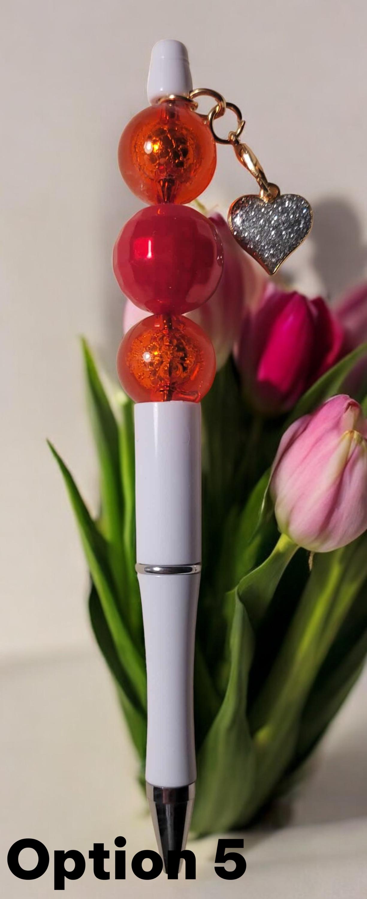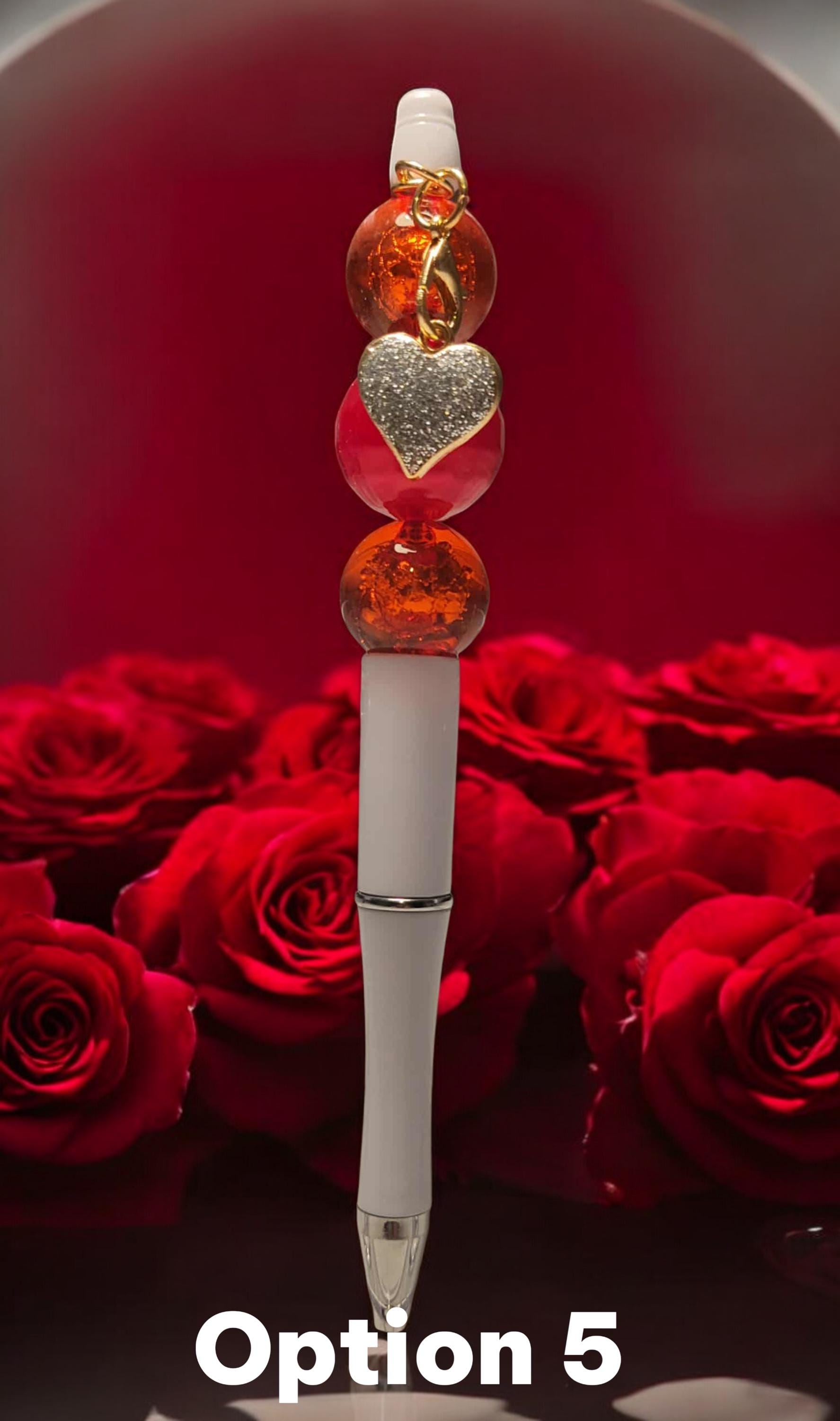 Option 5 - White Pen with red round and faceted acrylic beads, accented with a silver crystal heart charm.