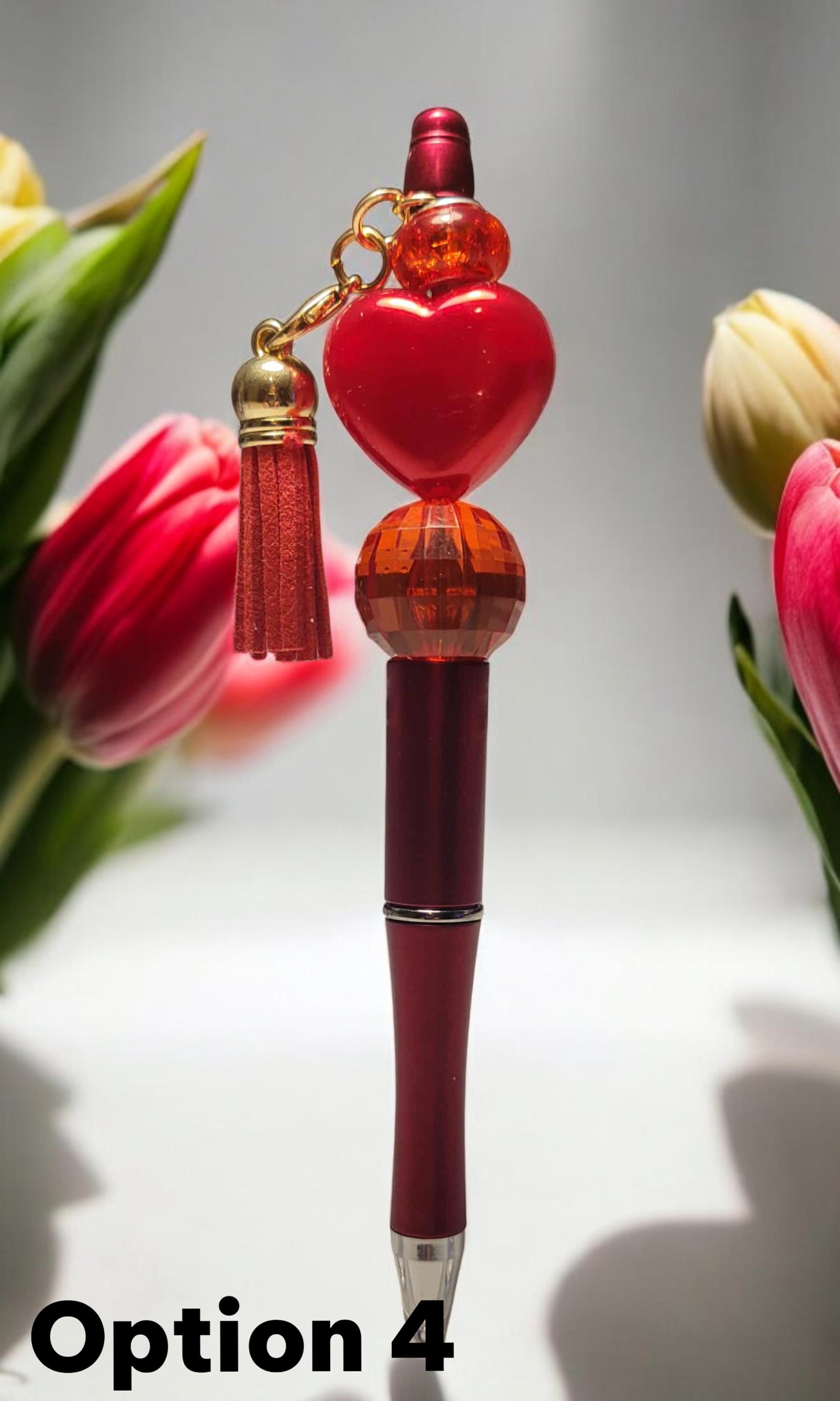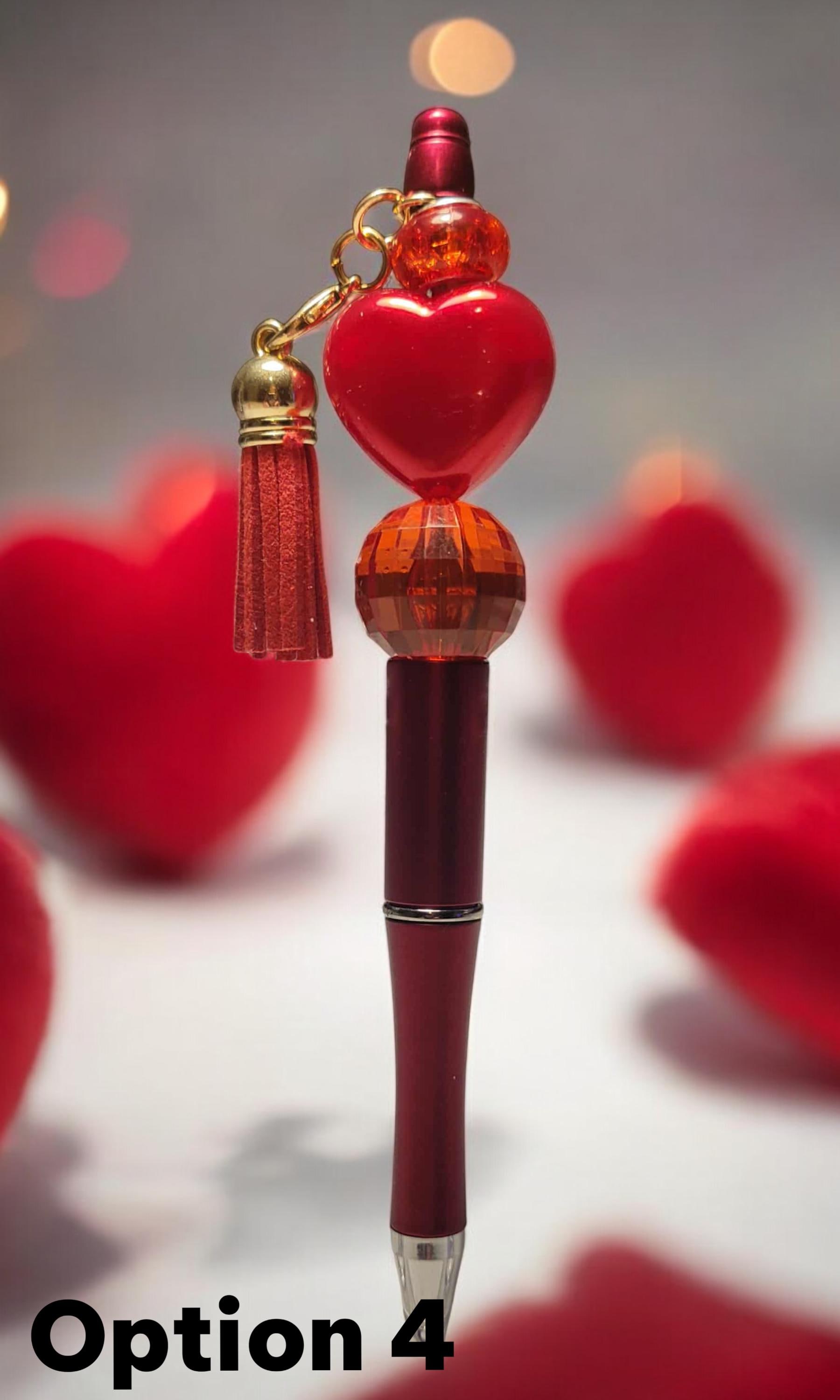 Option 4 - Dark Red Metallic Pen with red acrylic heart, red acrylic faceted bead, and red resin lampwork bead, accented by a red tassel.