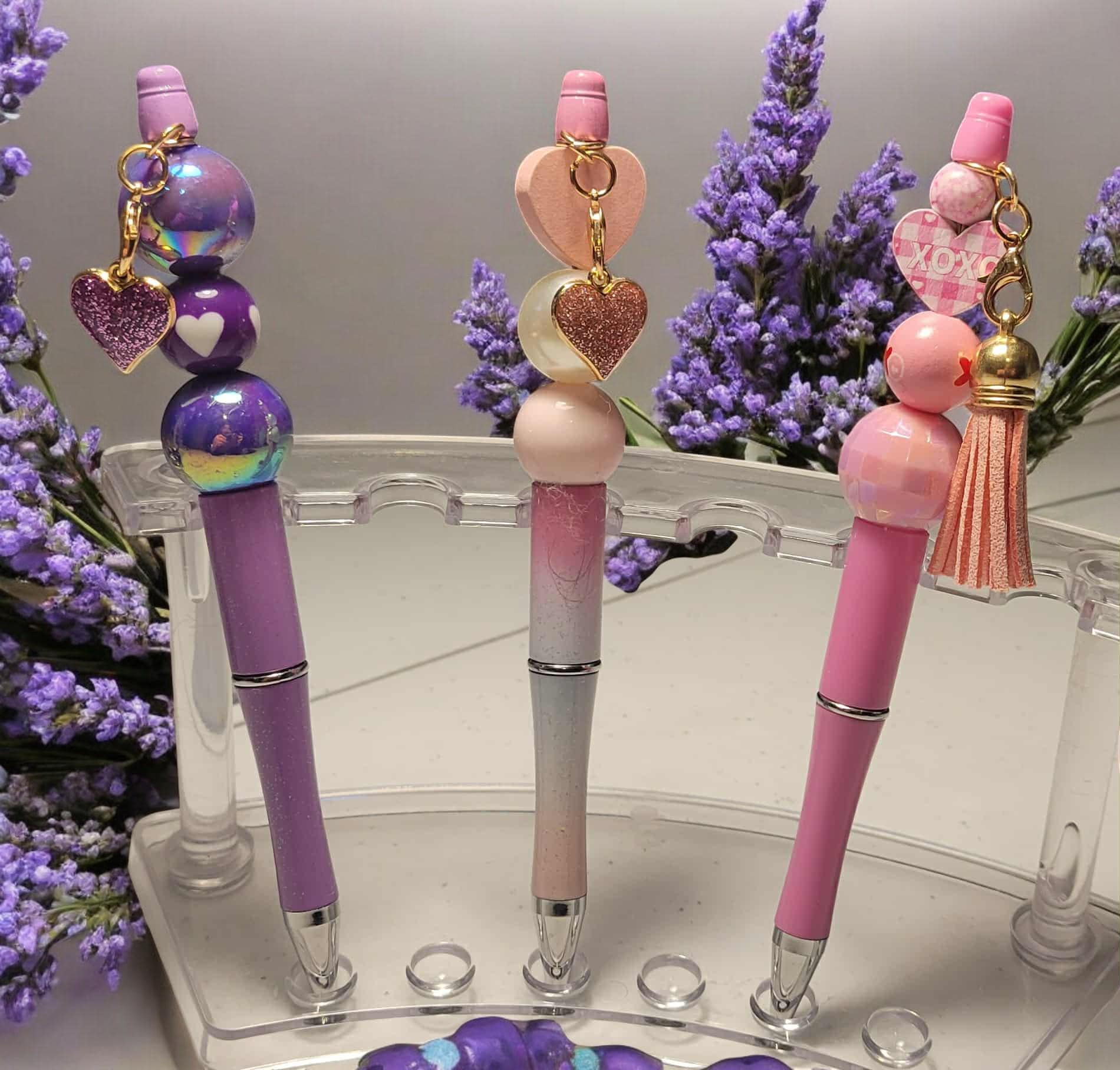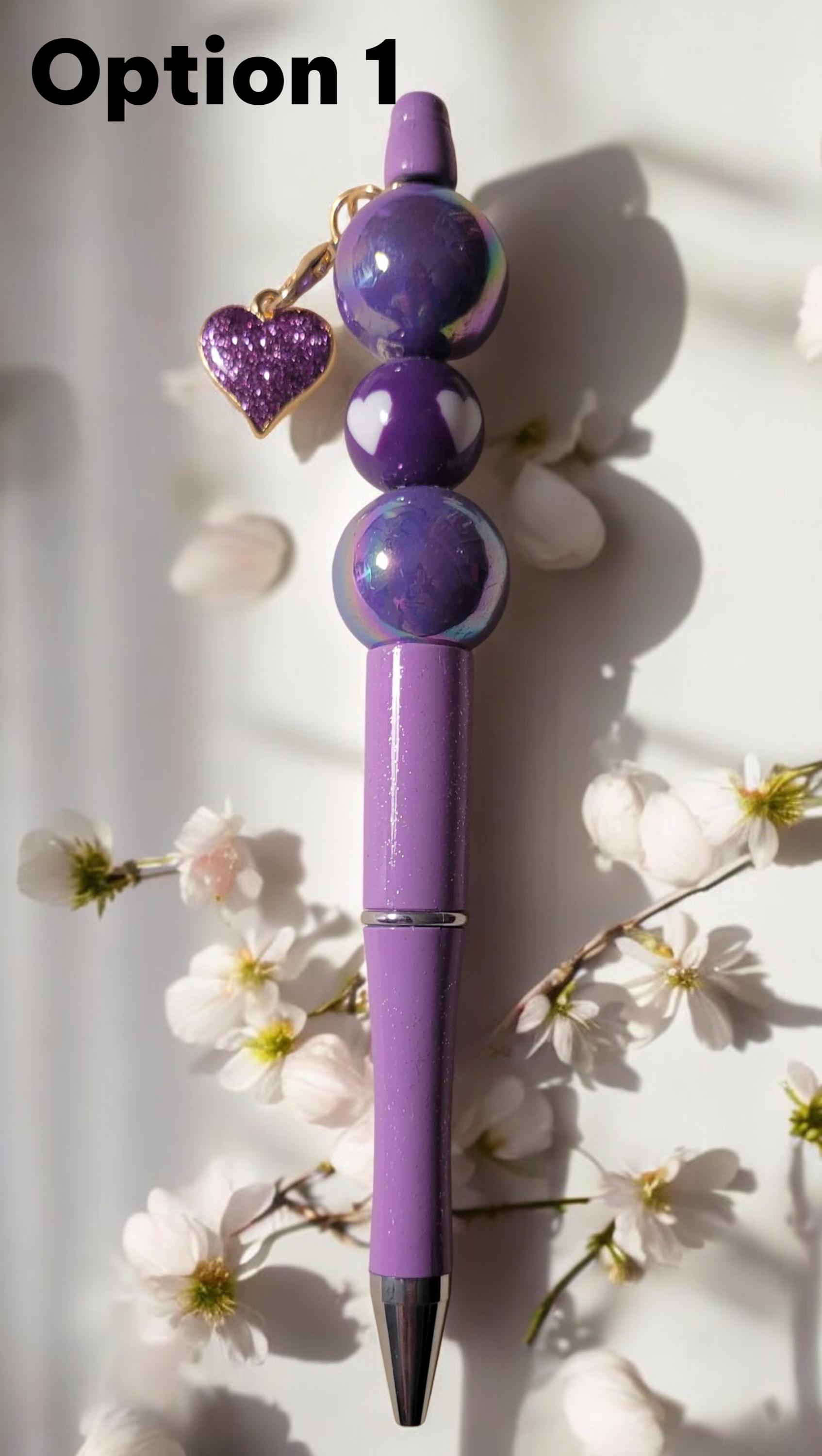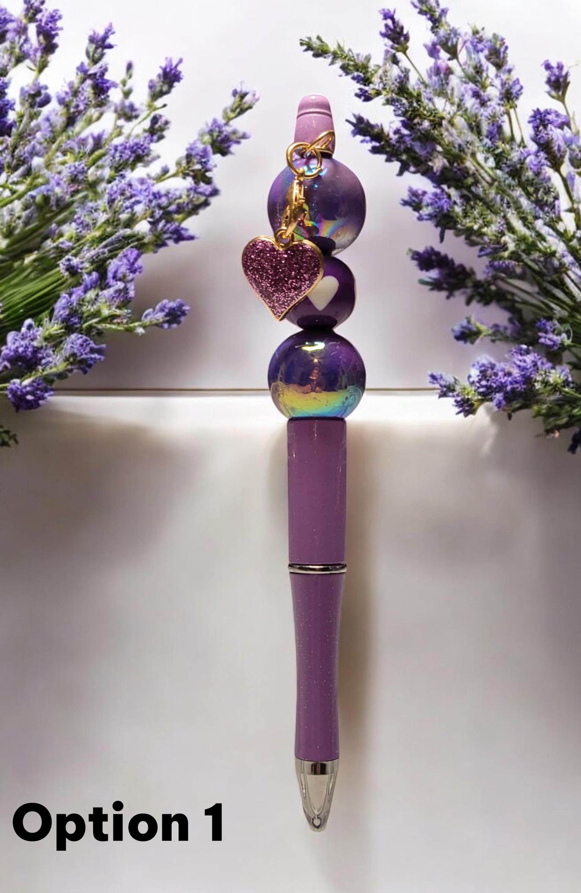 Option 1 - Purple pen with purple acrylic beads and a purple w/white hearts wood bead, accented by a gold-tone purple crystal heart charm.