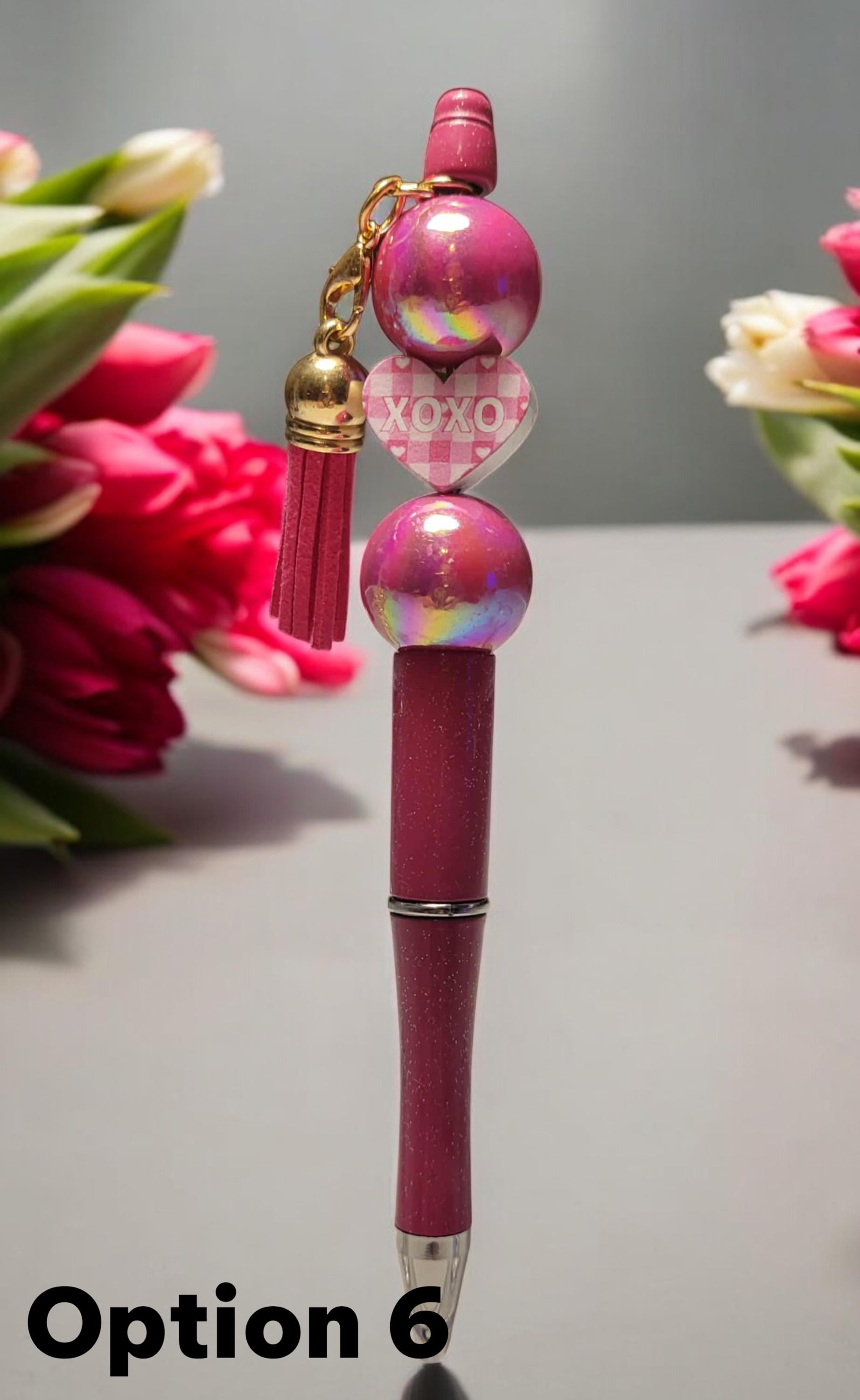Option 3 - Pink Pen with pink heart and pink round wooden beads, pink faceted acrylic beads, and pink tassel.