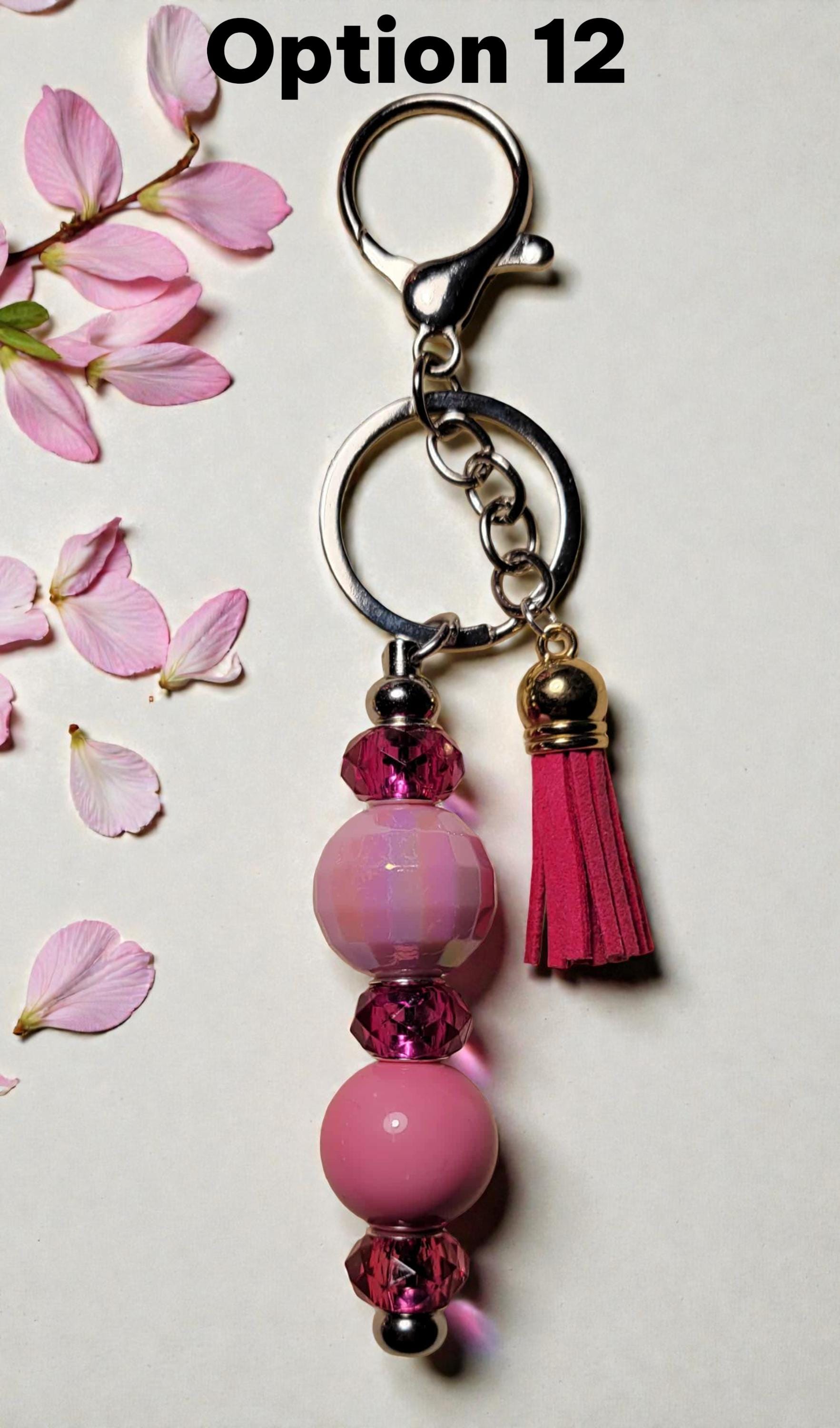 Option 12 - Silver Tone Keychain with dark pink glass spacer beads, pink acrylic beads, and dark pink tassel.