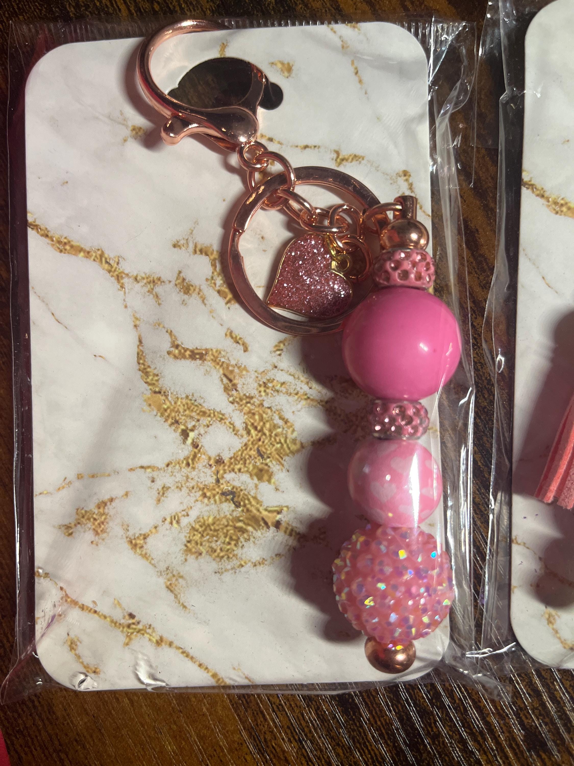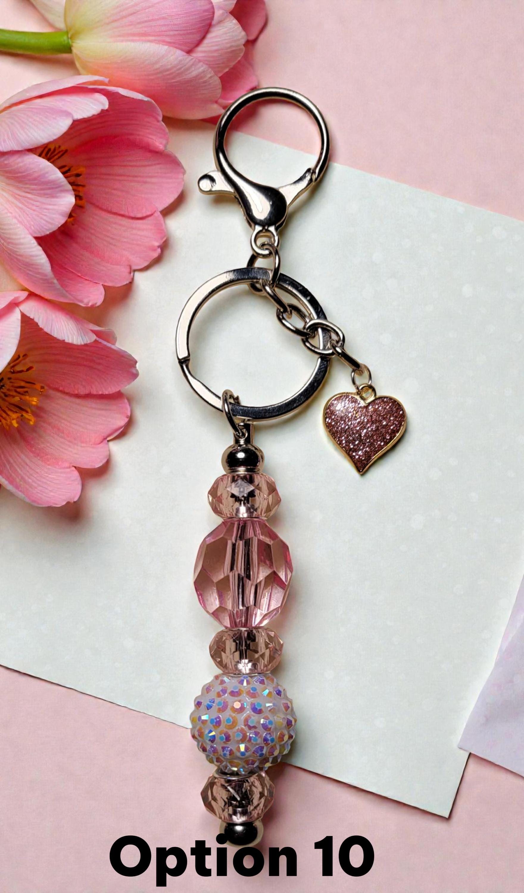 Option 1 - Rose Gold Keychain with solid pink acrylic bead, pink acrylic sparkle bead, pink rhinestone spacers, and pink sparkle heart charm.