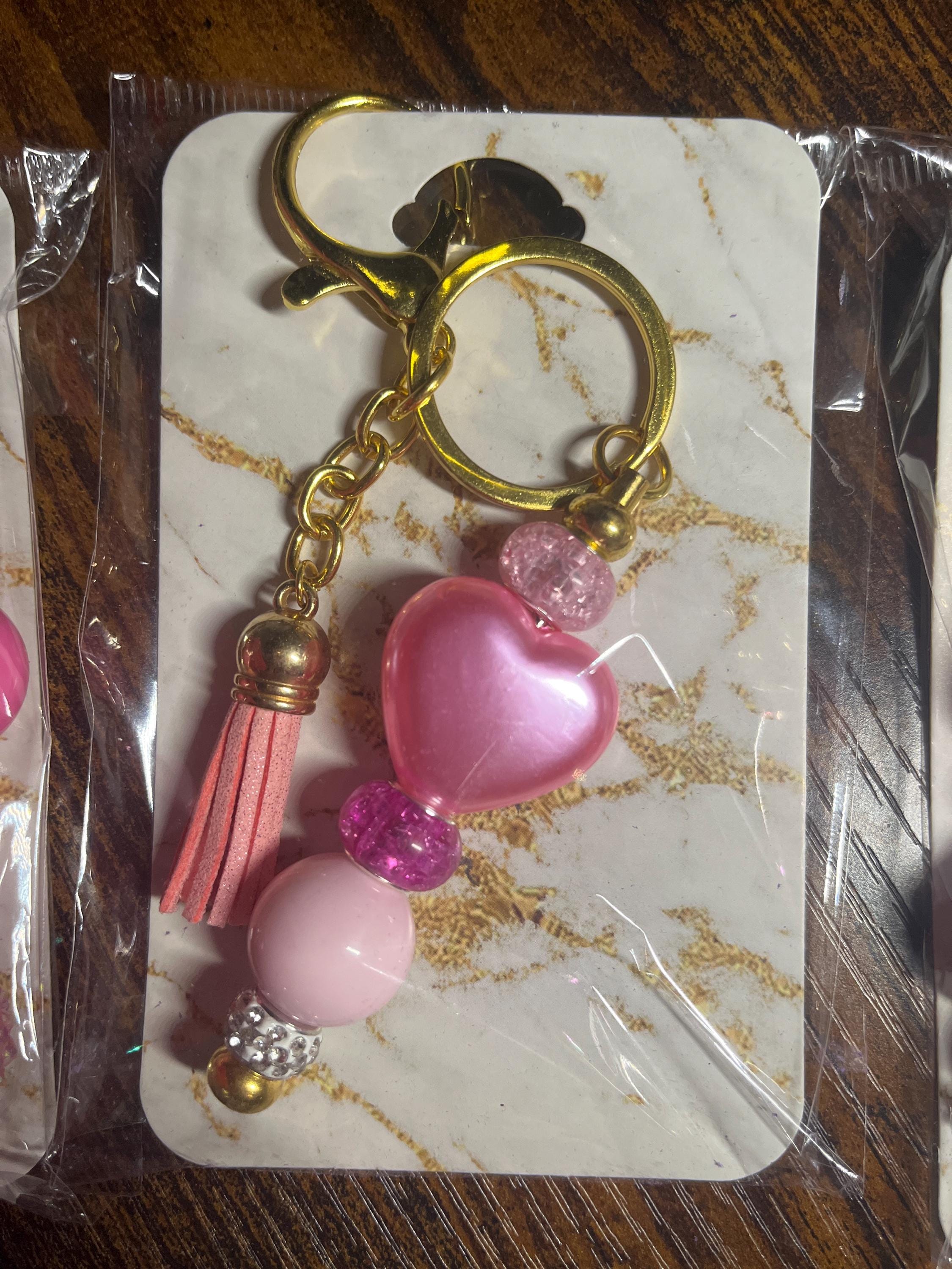 Option 2 - Gold Tone Keychain with pink glass spacer beads, pink acrylic heart bead, clear rhinestone spacer bead, and light pink tassel.