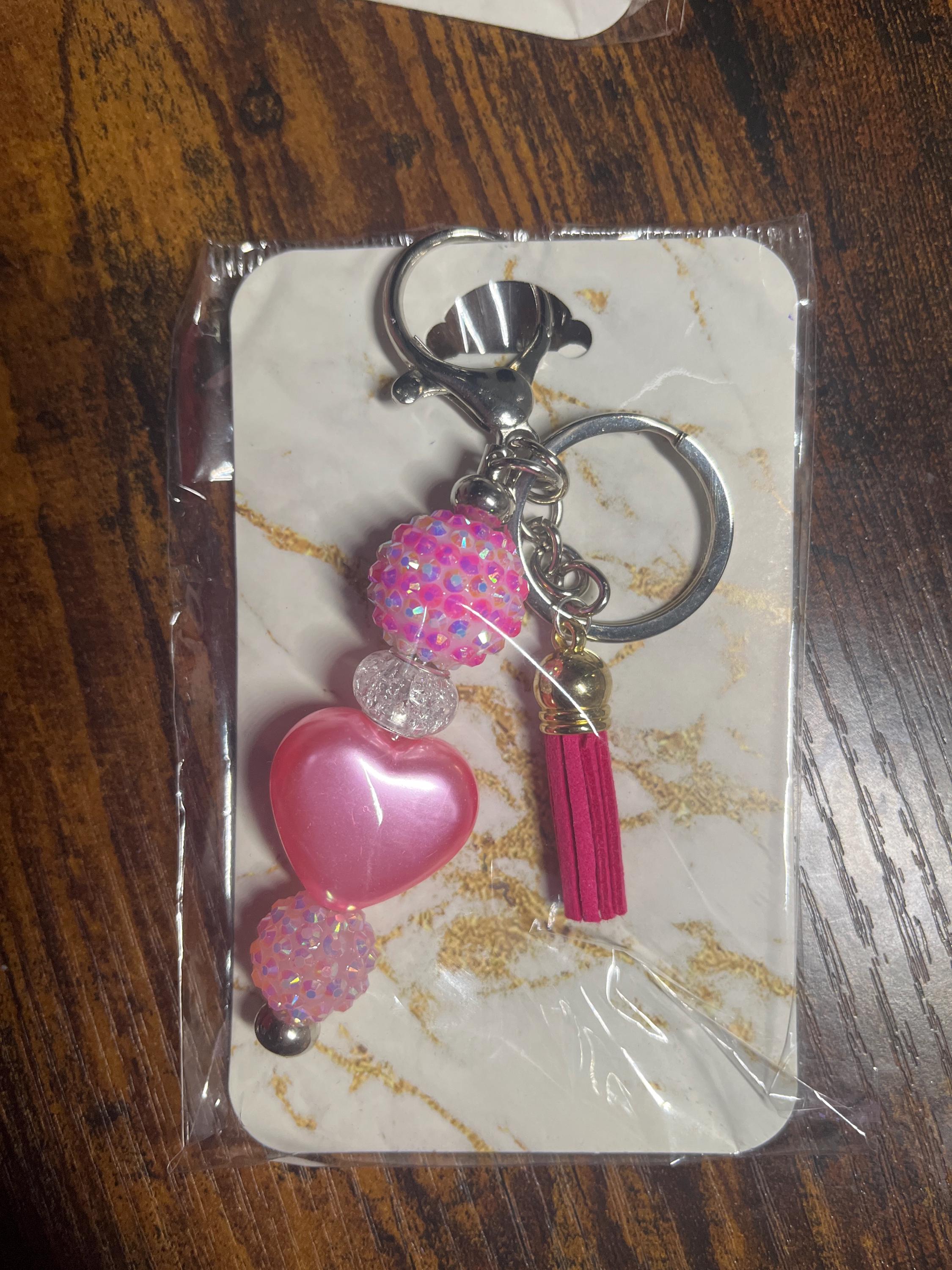 Option 4 - Silver Tone Keychain with acrylic sparkle beads, clear glass spacer bead, pink heart bead, and dark pink tassel.