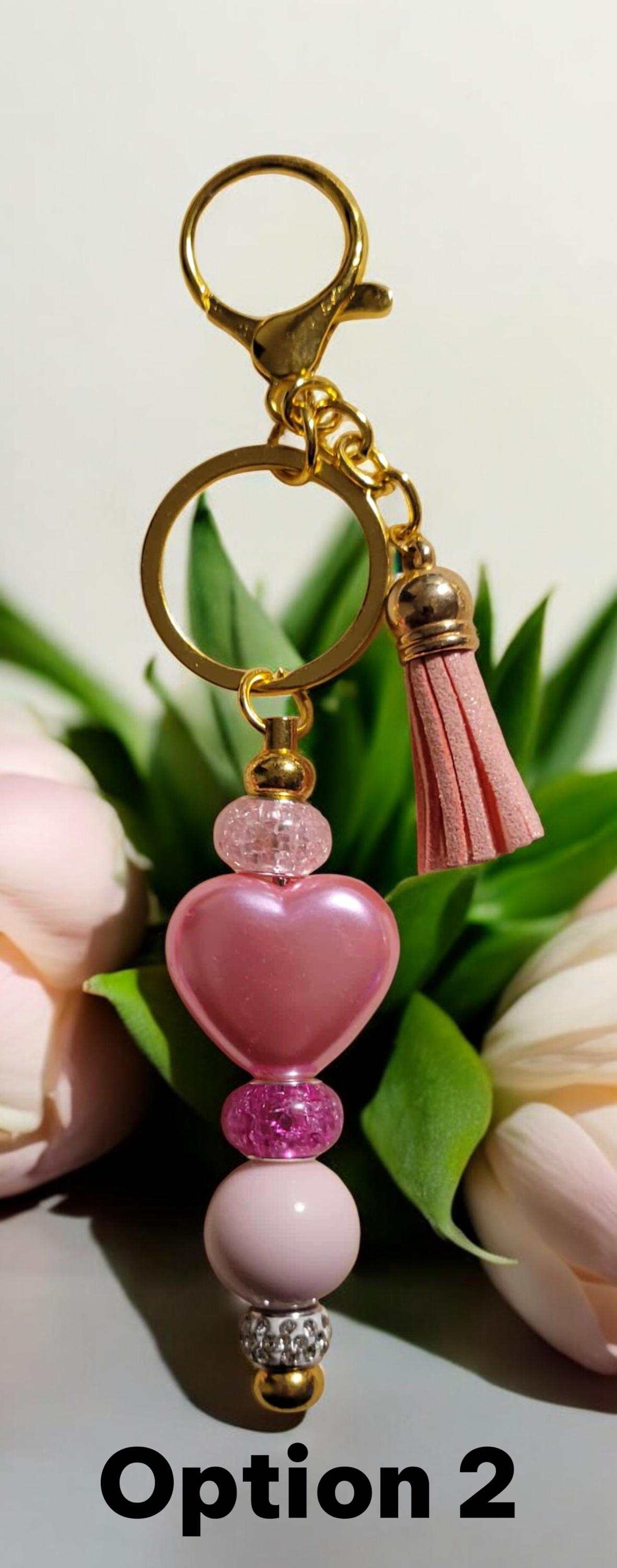 Option 2 - Gold Tone Keychain with pink glass spacer beads, pink acrylic heart bead, clear rhinestone spacer bead, and light pink tassel.