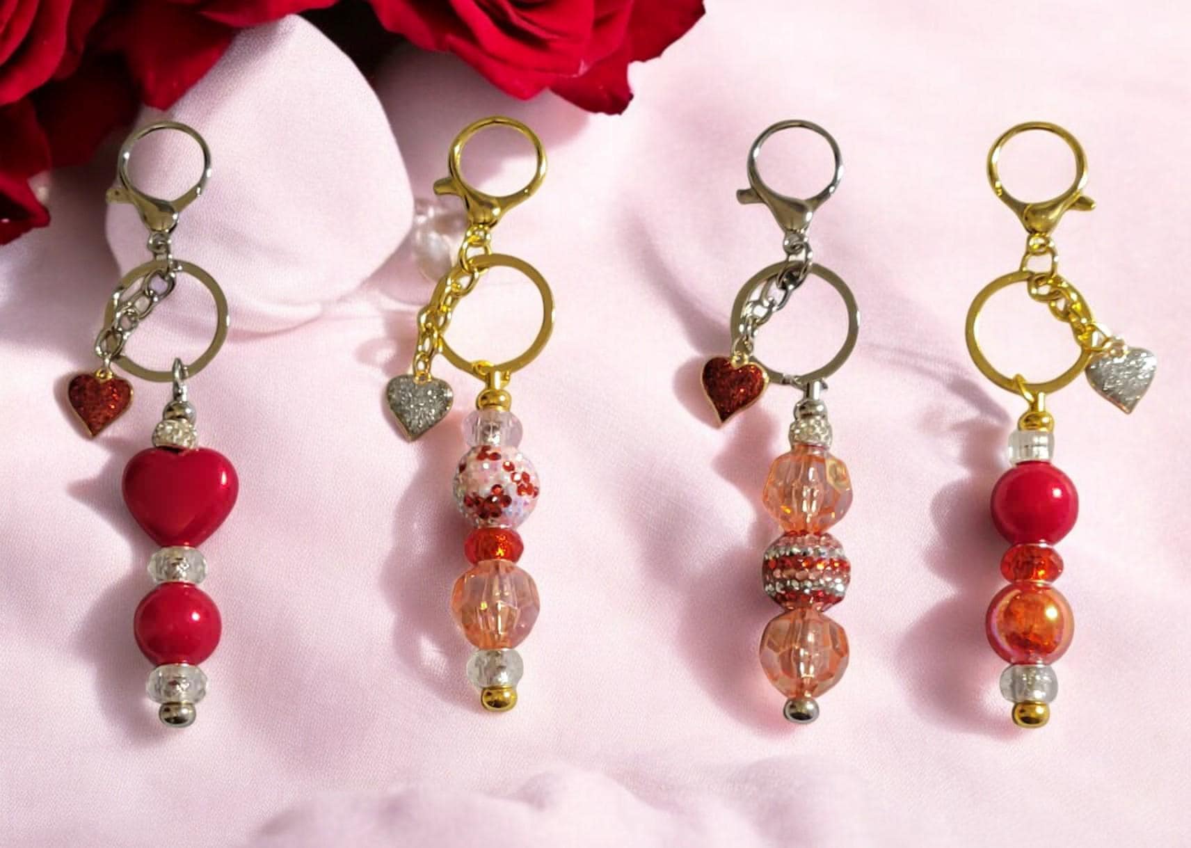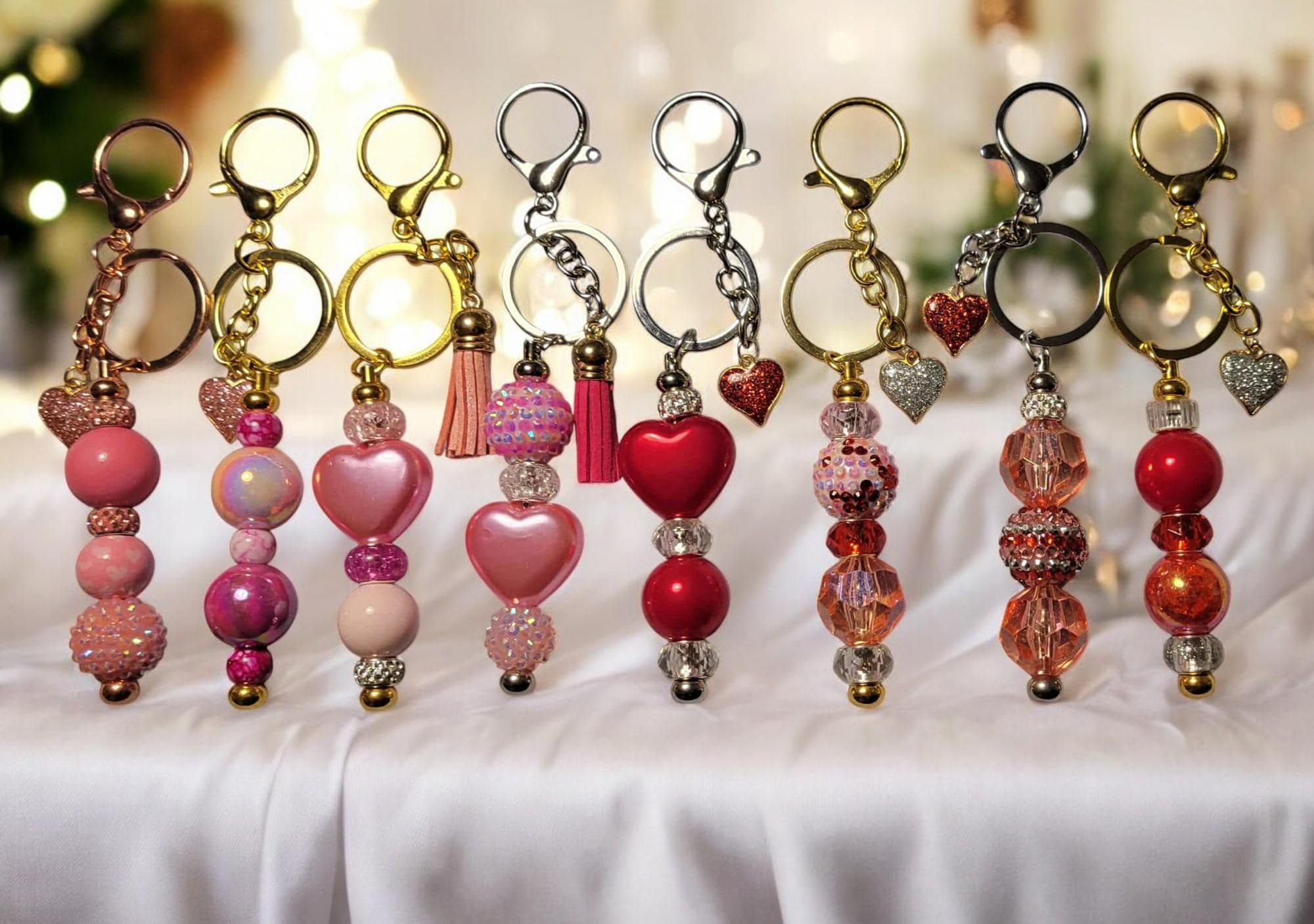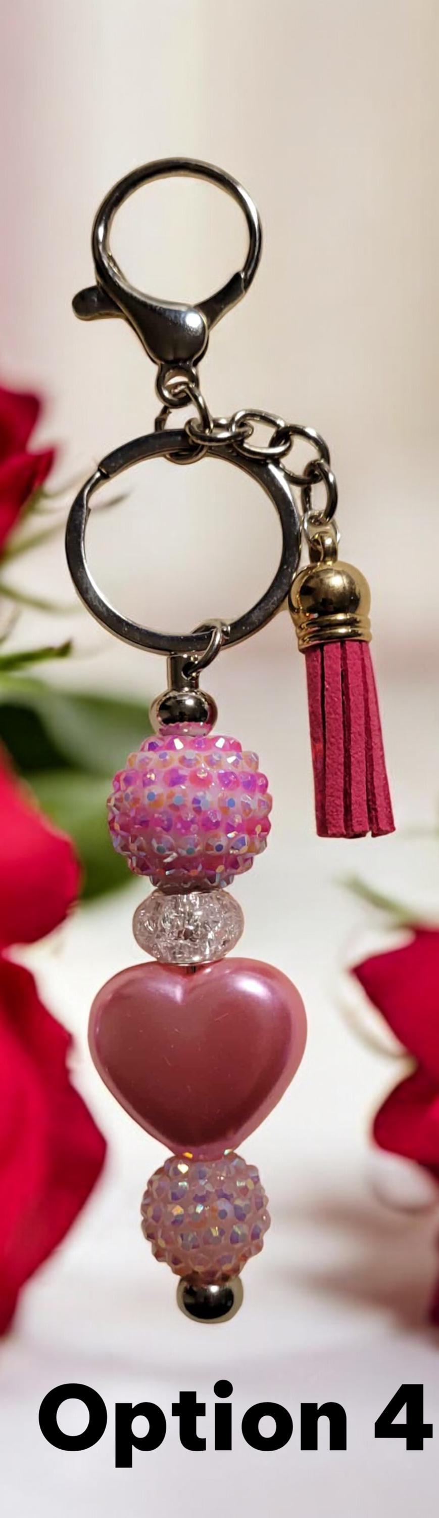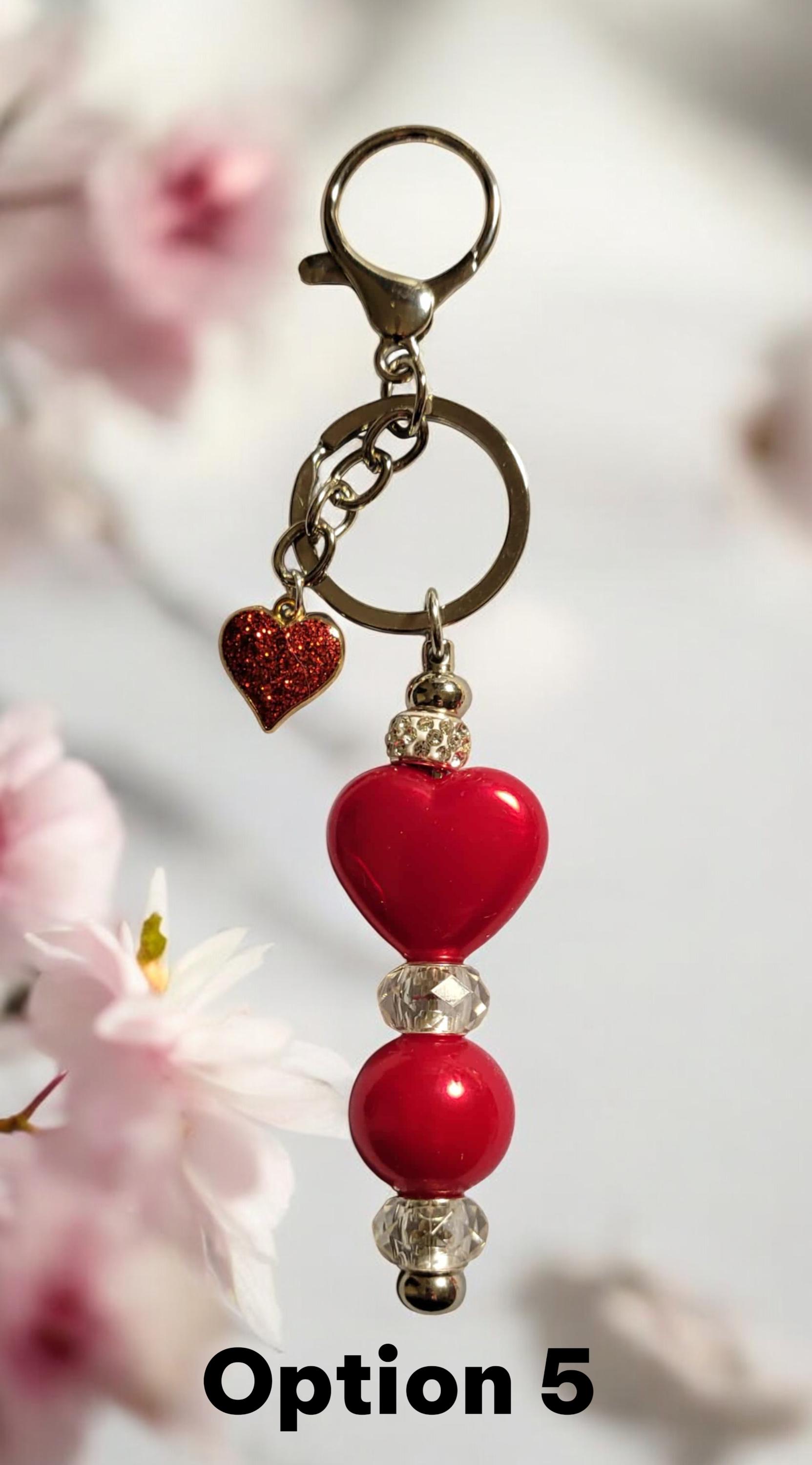 Valentine Beaded Keychains - These keychains are charming accessories that celebrate love. Crafted from a mix of acrylic, glass, wood, and rhinestone beads, they add sparkle and catch the eye. Whether clipped to a bag or attached to your keys, they bring a playful touch and a daily reminder that you are loved. All keychains measure approximately 5 3/4"x1".