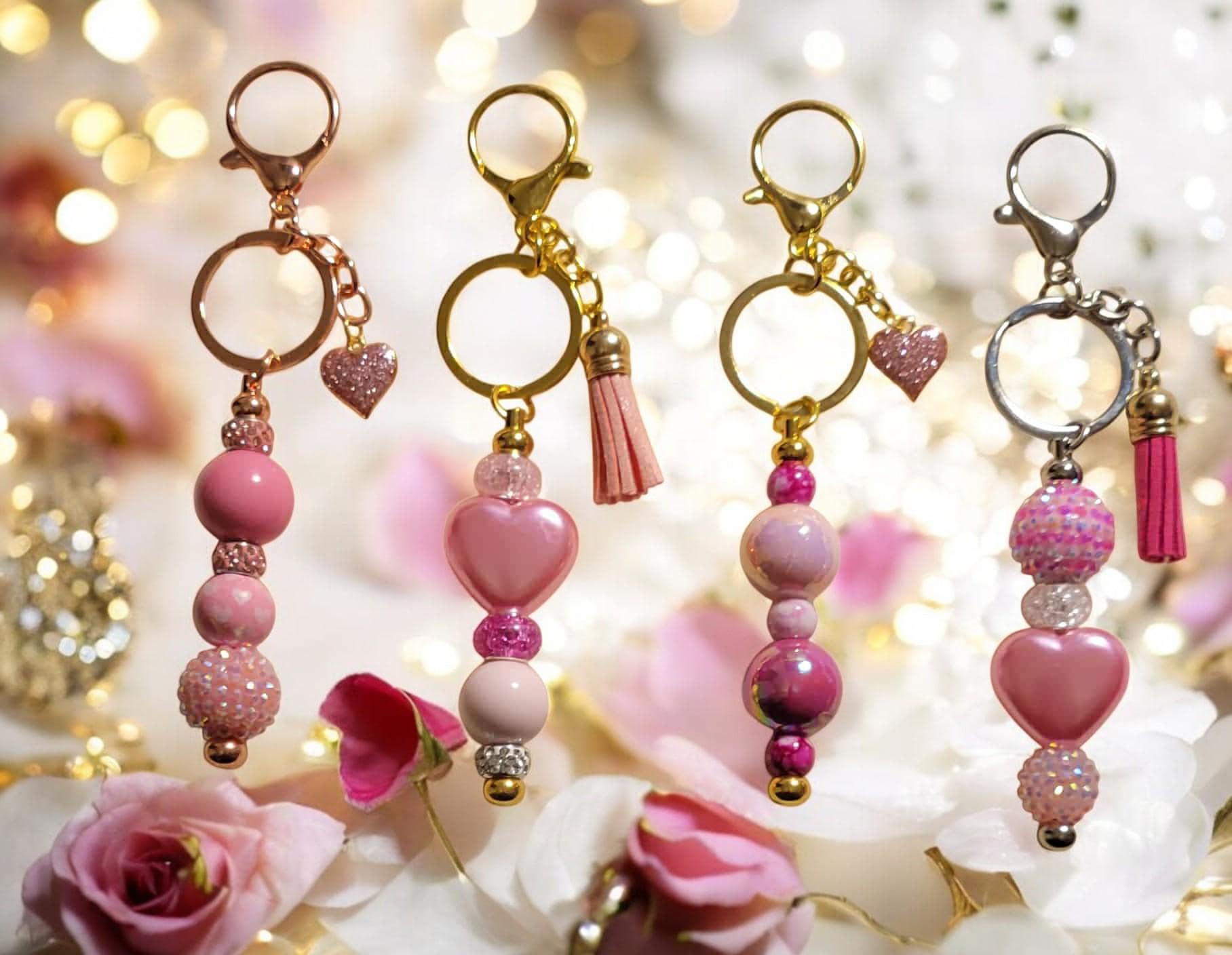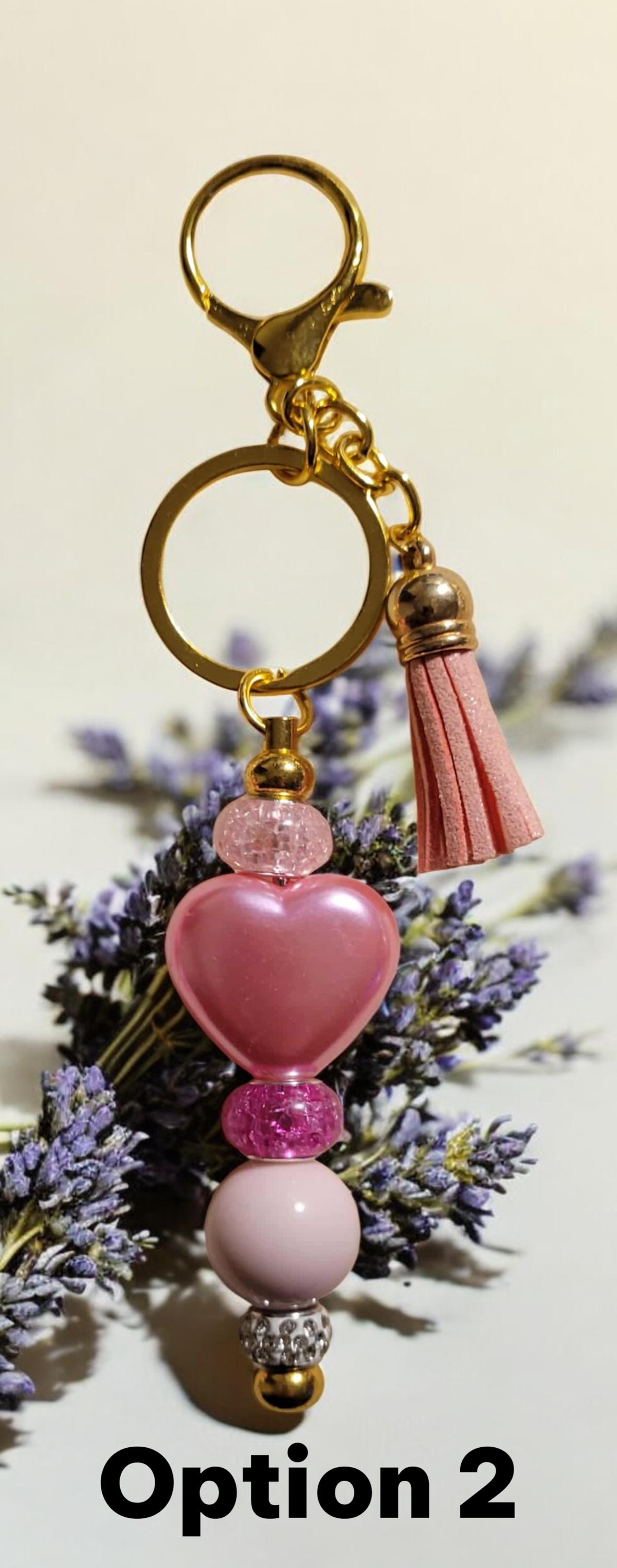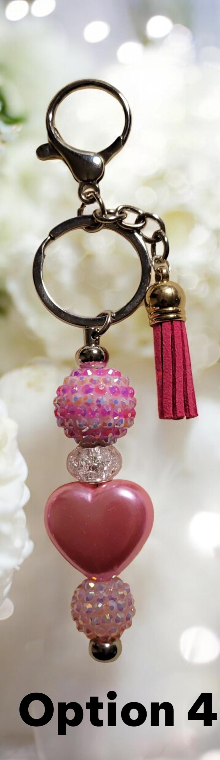 Option 1 - Rose Gold Keychain with solid pink acrylic bead, pink acrylic sparkle bead, pink rhinestone spacers, and pink sparkle heart charm.
