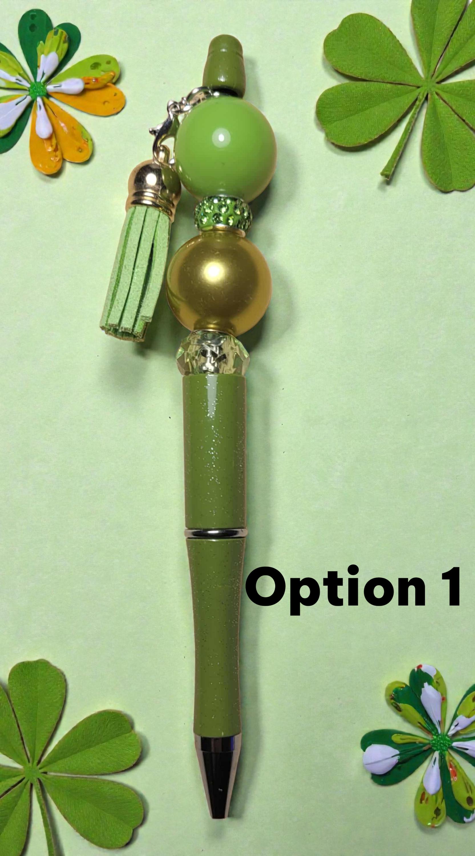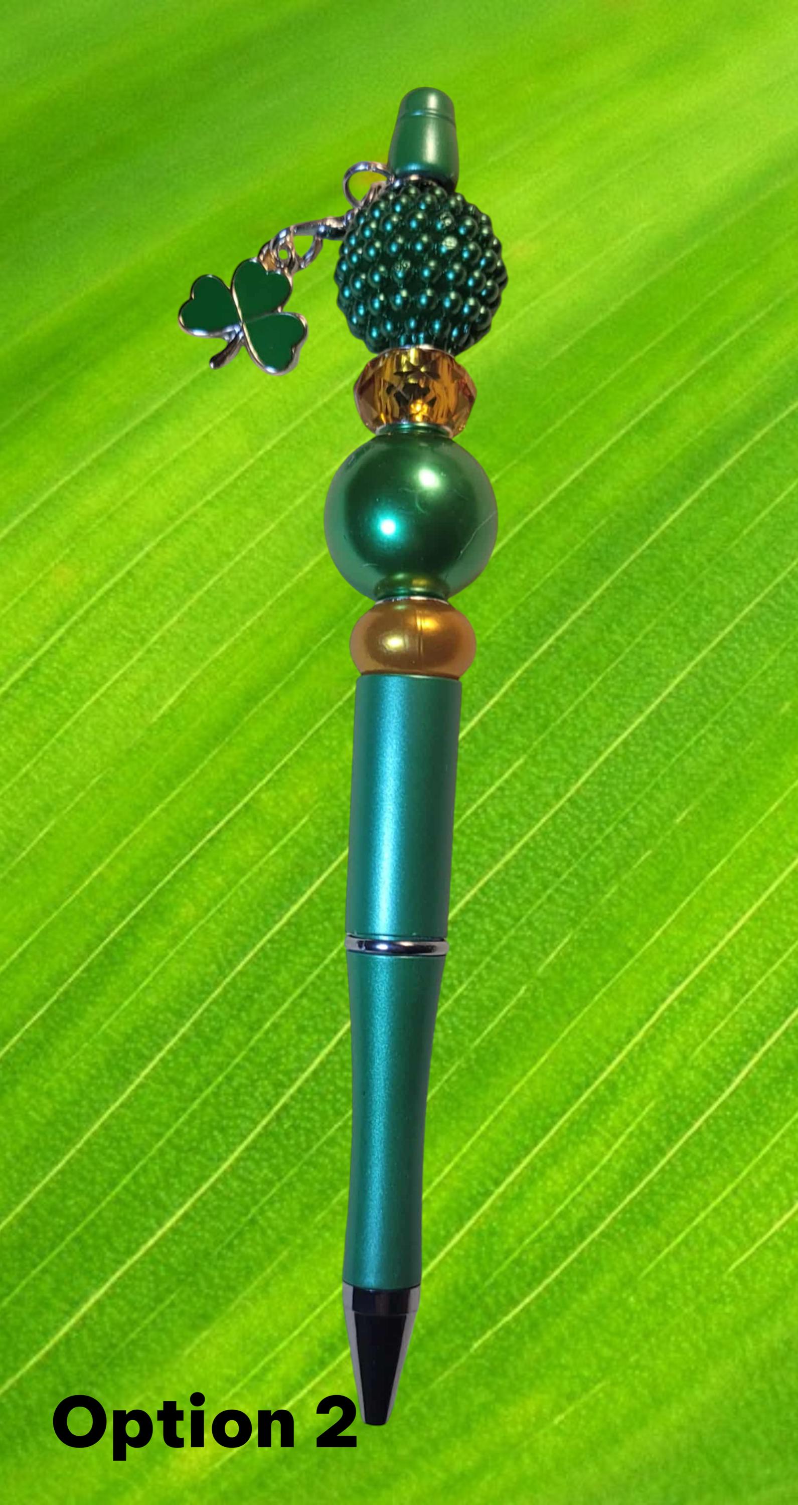Option 2 - Green Pen with green acrylic beads, gold acrylic spacers, and green shamrock charm.