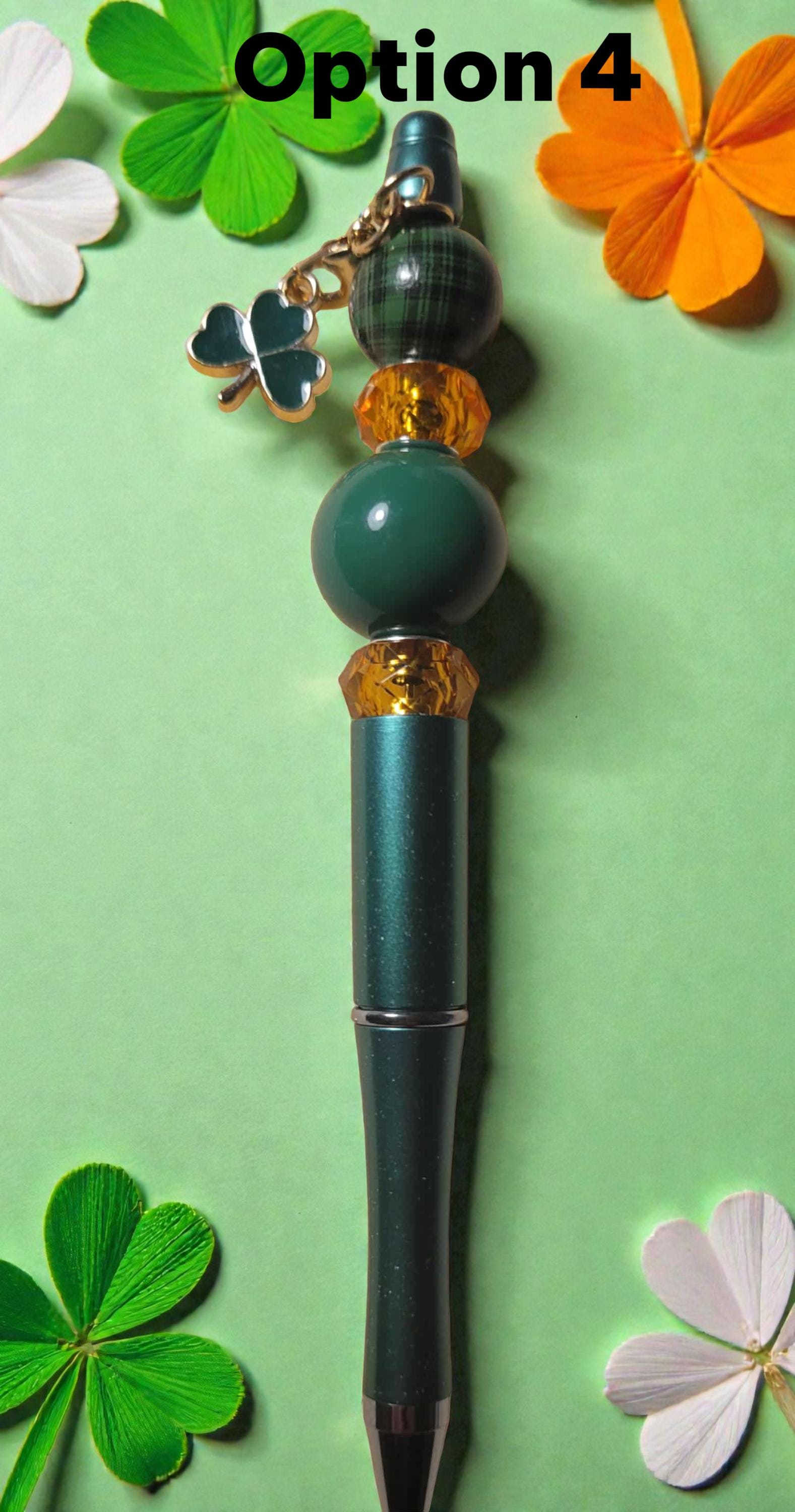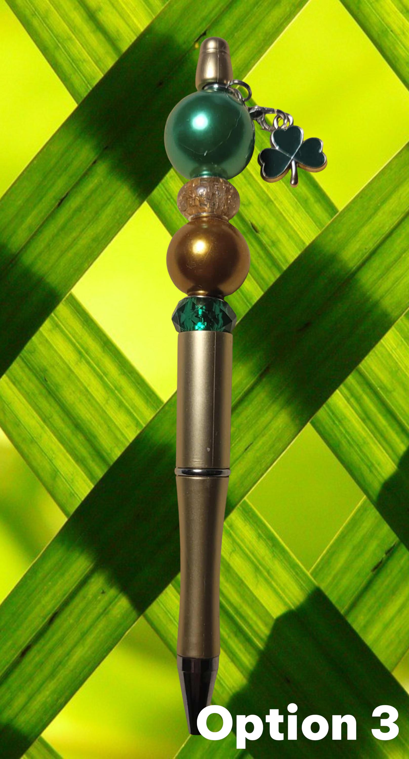 Option 3 - Gold Pen with green and gold acrylic beads, green and gold acrylic spacers, and green shamrock charm.