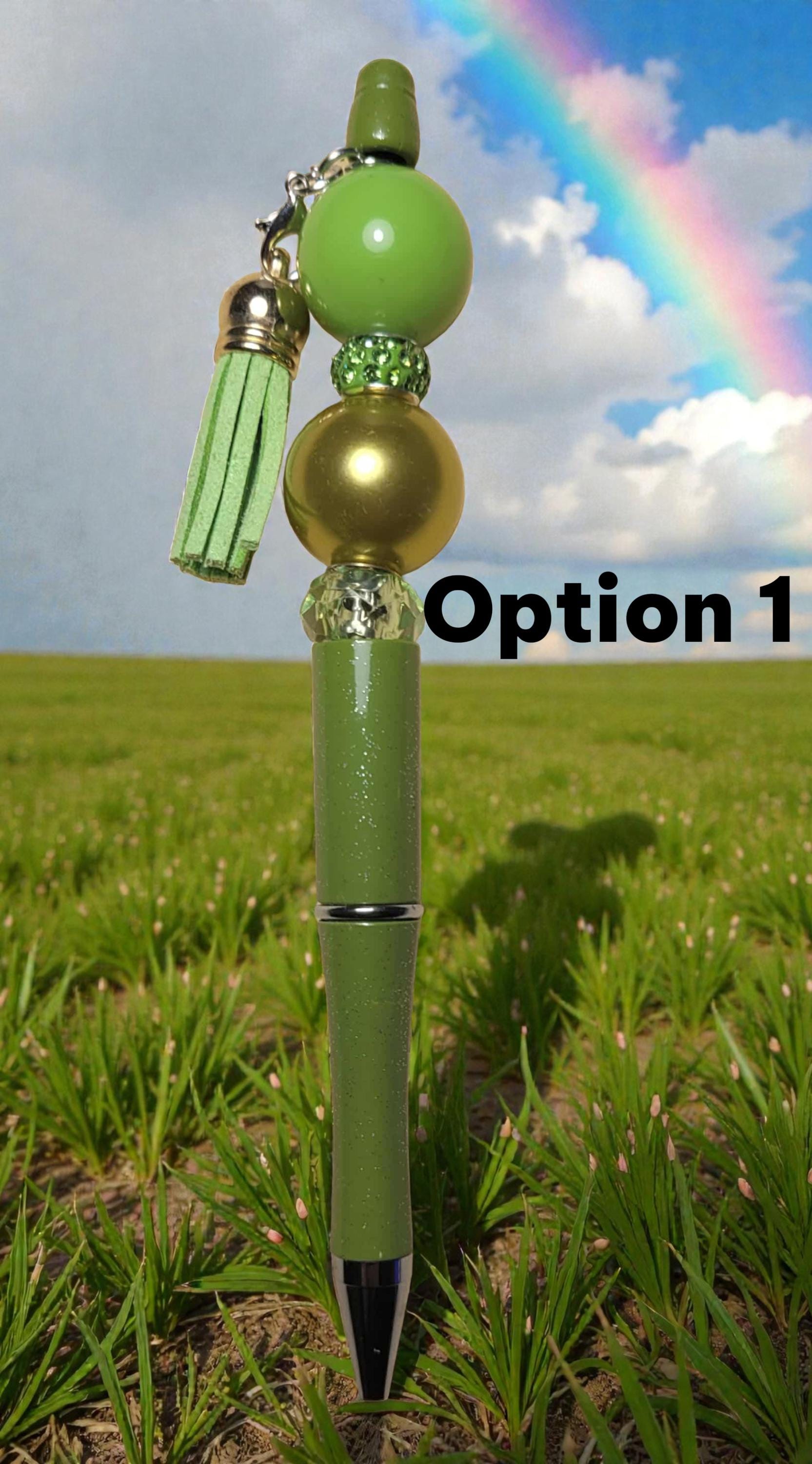 Option 1 - Light Green Pen with green and gold acrylic beads, green acrylic and rhinestone spacers, and light green tassel.