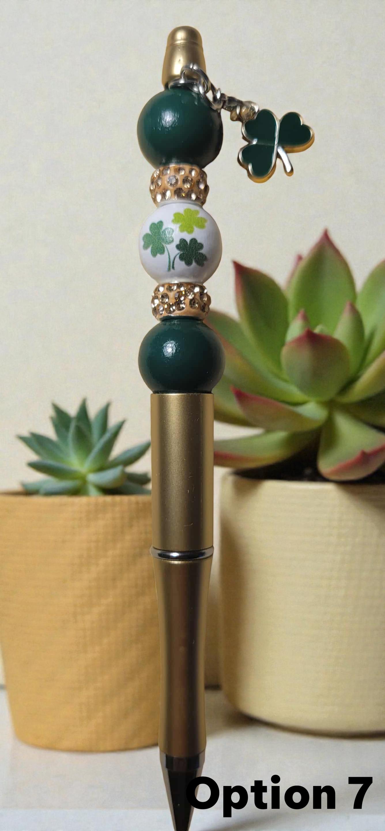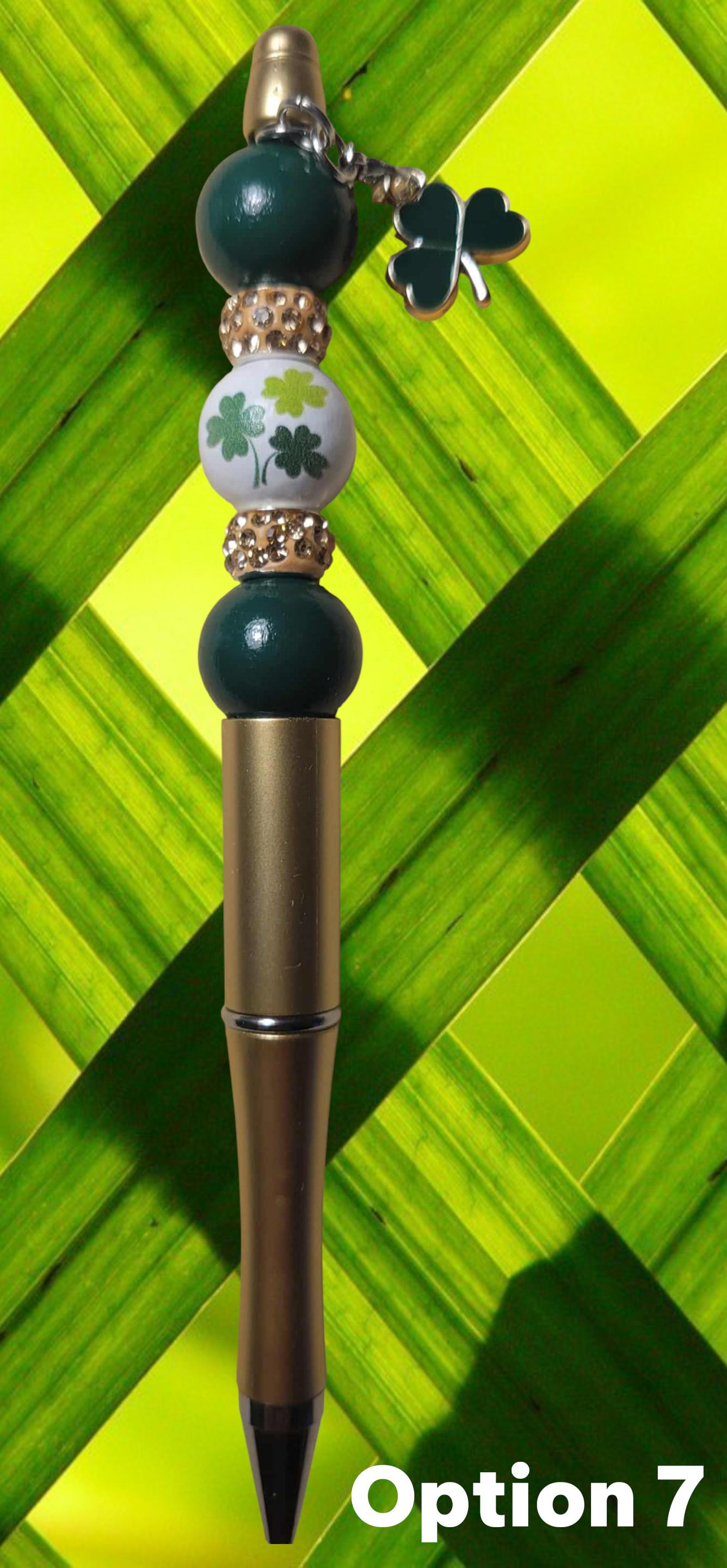 Option 7 - Gold Pen with green wooden beads, white wooden bead with green shamrocks, gold rhinestone spacers, and green shamrock charm.