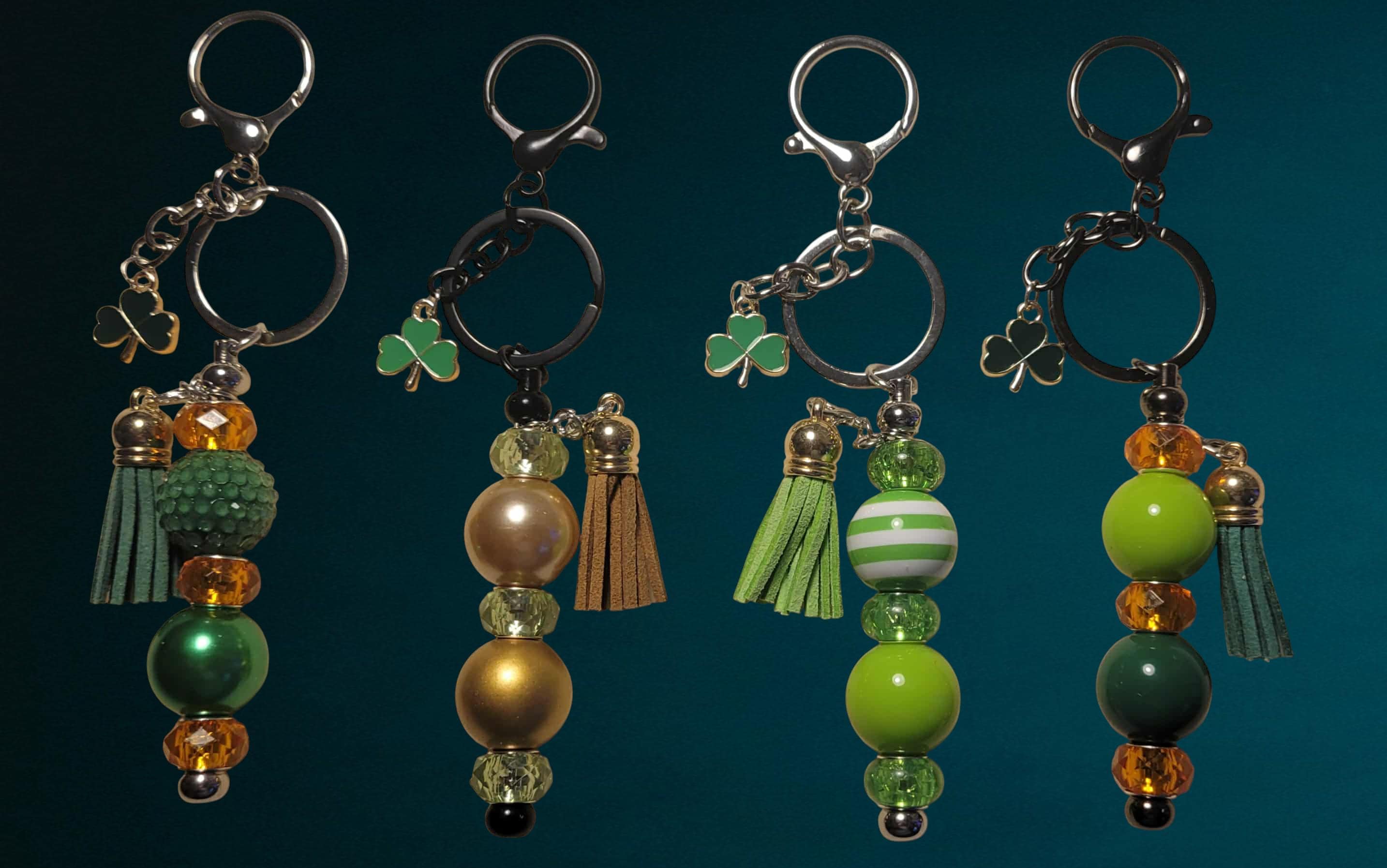 Option 1 - Gunmetal Keychain with light and dark green acrylic beads and gold acrylic spacers. This keychain features a dark green tassel and dark green shamrock charm.